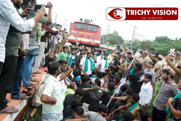 பின்னர் ரயில் தண்டவாளத்தில் அமர்ந்த போராட்டத்தில் ஈடுபட்டனர். இதனையடுத்து போராட்டக்காரர்களை போலீசார் கைது செய்தனர். இதற்கிடையில் திடீரென ஜனசதாப்தி விரைவு ரயில் வந்ததால் போராட்டகாரர்ரகள் ரயில் முன்பு ஓடினர். இதனால் பாதுகாப்பு பணியில் இருந்த போலீசார் அலறினர்.