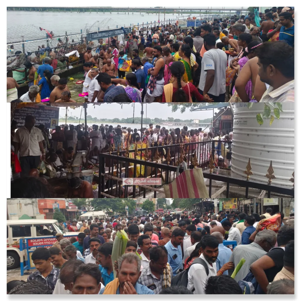இன்று விடுமுறை தினம் என்பதால் தமிழகத்தின் பல்வேறு மாவட்டங்களில் இருந்து பல்லாயிரக்கணக்கான பொதுமக்கள் வருகை தந்து ஸ்ரீரங்கம் அம்மா மண்டபம் காவிரி படித்துறை, அய்யாளம்மன் படித்துறை, ஓடத்துறை படித்துறைகளில் காவிரி ஆற்றில் புனித நீராடி முன்னோர்களுக்கு தர்ப்பணம் கொடுத்துவிட்டு அருகாமையில் இருக்கும் கோவில்களுக்கு சென்று வழிபாடு செய்து வருகின்றனர்