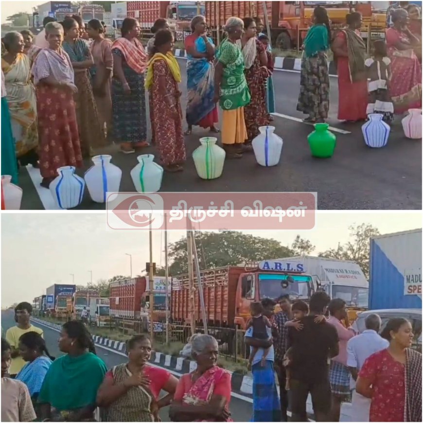 கிராம மக்கள் கடும் சிரமத்திற்கு ஆளாகி வந்துள்ளனர்.இதனால் ஆத்திரம் அடைந்த கிராம மக்கள் திருச்சி – சென்னை தேசிய நெடுஞ்சாலைகள் மட்டும் இன்றி அதனை ஒட்டி செல்லக்கூடிய இரண்டு சர்வீஸ் சாலைகளிலும் காலி குடங்களுடன் மறியல் போராட்டத்தில் ஈடுபட்டு வருகின்றனர்.