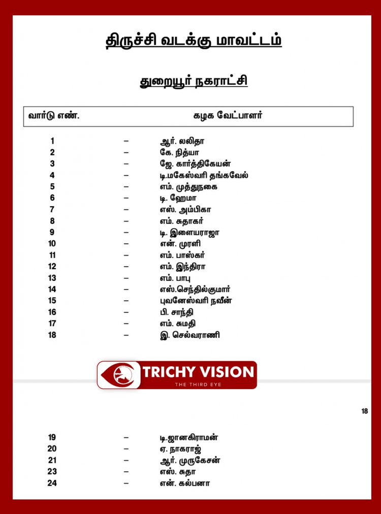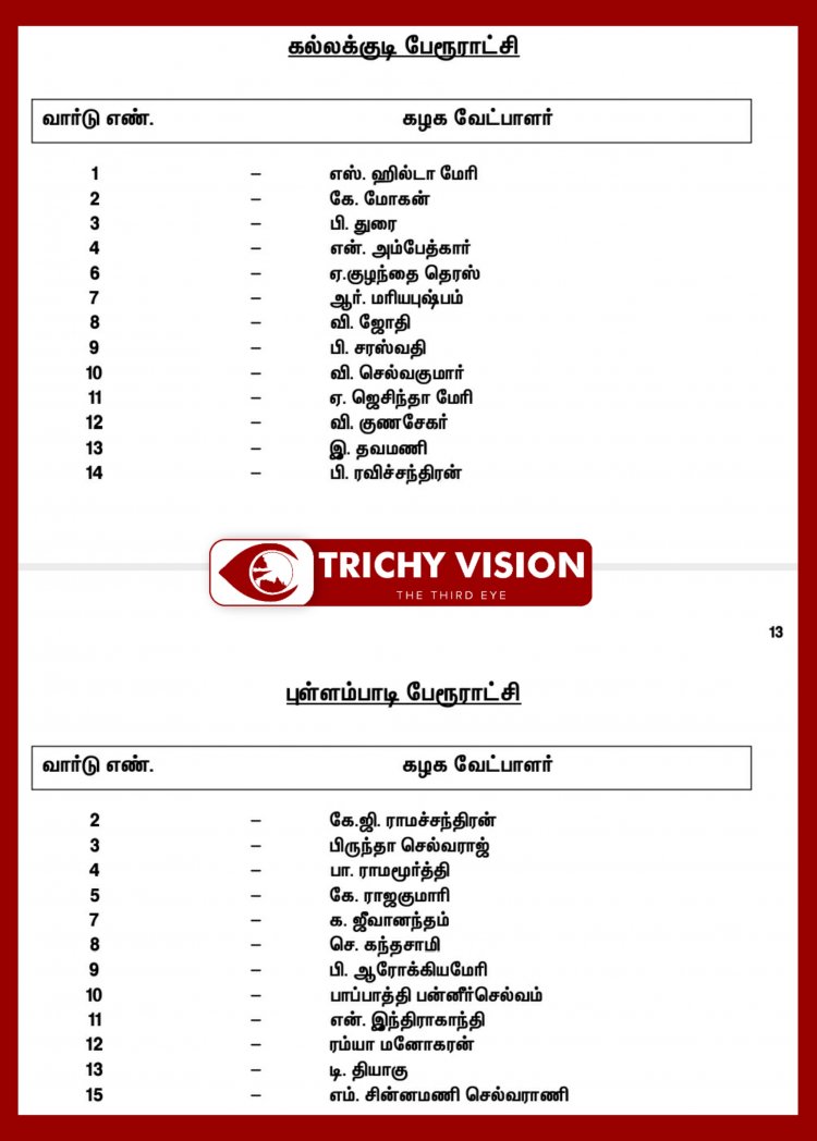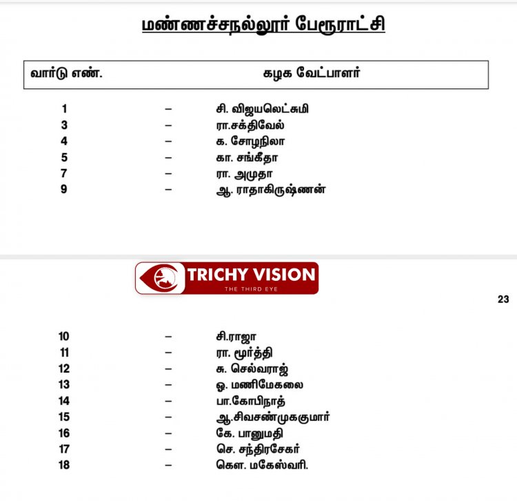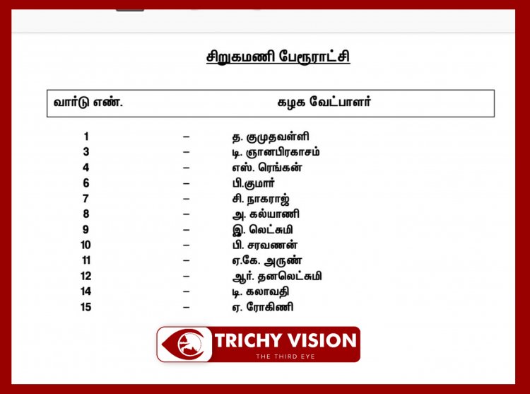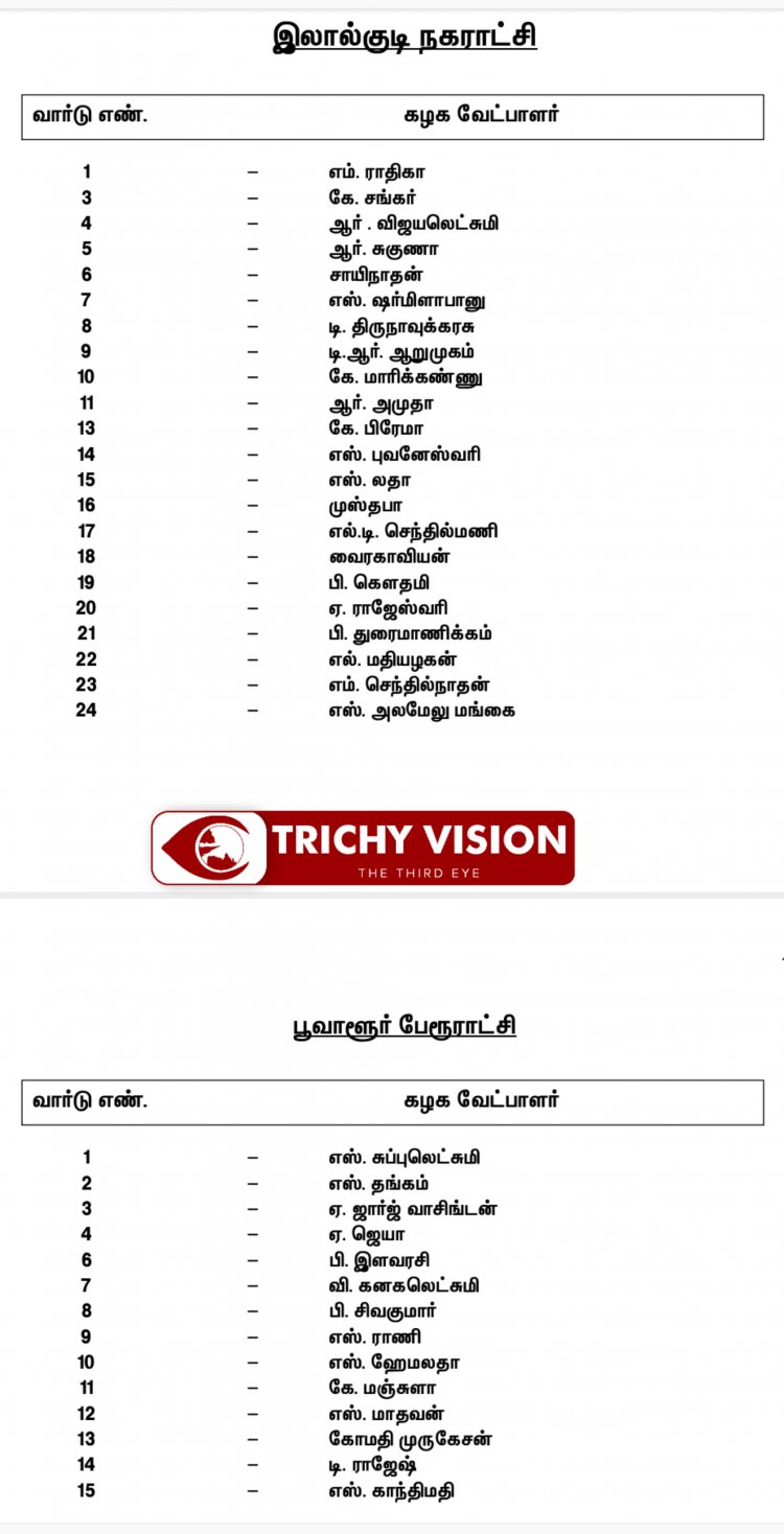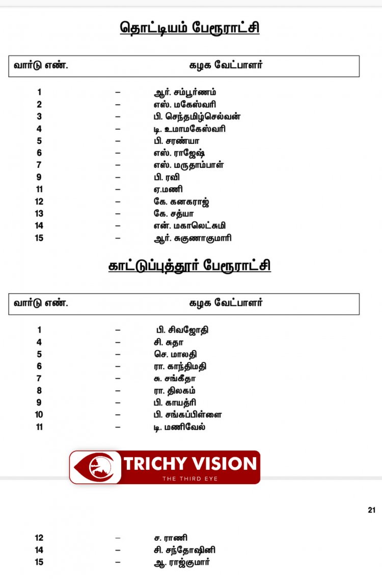 திருச்சி மாவட்டத்தில் 5 நகராட்சிகளுக்கும் 14 பேரூராட்சிகளுக்கும் நகர்ப்புற உள்ளாட்சி தேர்தல் நடைபெறுகிறது. அதற்கான வேட்பாளர் பட்டியலை திமுக அறிவித்துள்ளது.