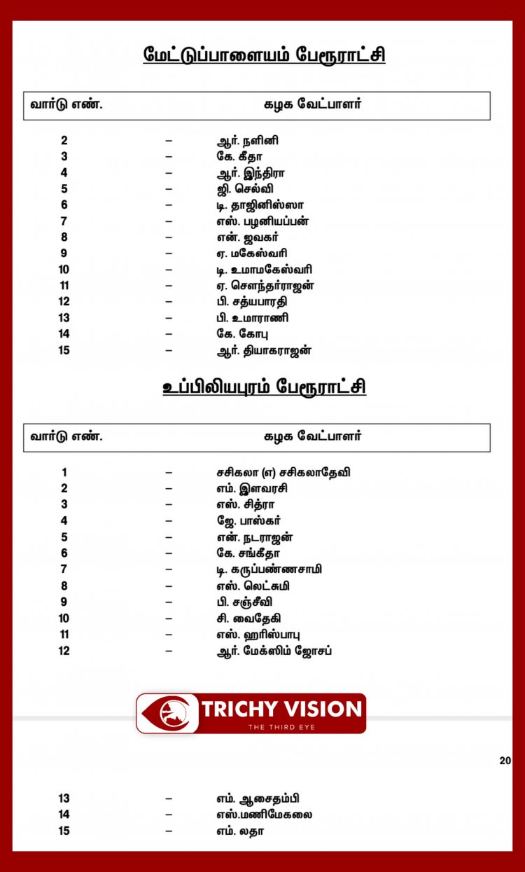 திருச்சி மாவட்டத்திலுள்ள நகராட்சி, பேரூராட்சிகளில் 336 வார்டுகளுக்கு தேர்தல் நடைபெற உள்ளது என்பது குறிப்பிடத்தக்கது.