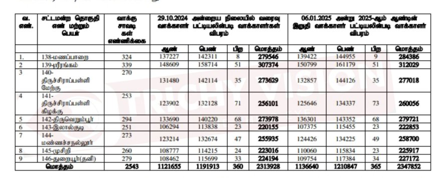 மேற்படி பட்டியலின்படி, திருச்சிராப்பள்ளி மாவட்டத்தில் உள்ள ஒன்பது சட்டமன்ற தொகுதிகளுக்கான 2025-ஆம் ஆண்டின் இறுதி வாக்காளர் பட்டியல் வெளியிடப்பட்டதன் அடிப்படையில் கீழ்கண்ட விபரங்கள் உள்ளது.