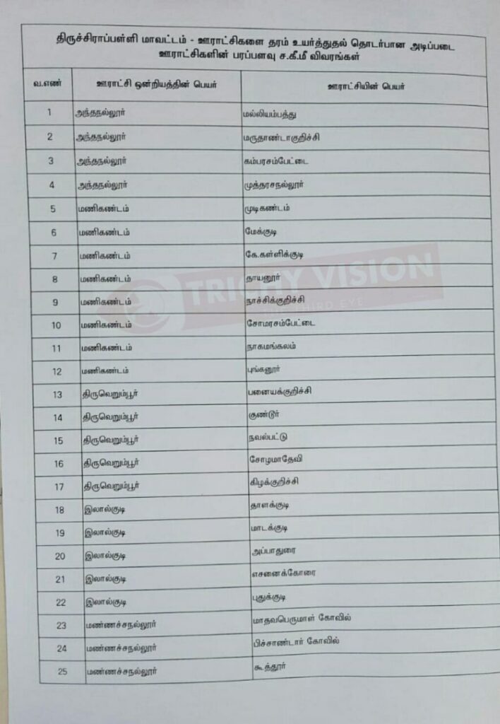 திருச்சி மாநகராட்சிக்கு உட்பட்ட 65 வார்டுகள் உள்ளன. இந்த வார்டுகளின் எண்ணிக்கை அதிகரித்து பல்வேறு ஊராட்சிகளை மாநகராட்சியுடன் இணைக்க திட்டமிடப்பட்டது. அதன் அடிப்படையில் திருச்சி மாவட்டத்தில் மல்லியம்பத்து, மருதண்டகுறிச்சி, கம்பரசம்பேட்டை, முத்தரசநல்லூர், முடிகண்டம், மேக்குடி, கே.கள்ளிக்குடி, தாயனூர், நாச்சிகுறிச்சி, சோமரசம்பேட்டை, நாகமங்கலம், புங்கனூர், பனையங்குறிச்சி, குண்டூர், நவல்பட்டு, சோழமாதேவி கீழக்குறிச்சி, தாளக்குடி, மாடக்குடி, அப்பாதுரை, எசனைக்கோரை, மாதவப் பெருமாள் கோவில், பிச்சாண்டார் கோவில், கூத்தூர் ஆகிய 25 ஊராட்சிகளை மாநகராட்சியுடன் இணைக்கப்படுகிறது.