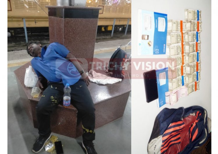திருச்சி ஜங்ஷன் ரயில் நிலையத்தில் ரயில்வே காவல் உதவி ஆய்வாளர் பாலமுருகன் தலைமையில் காவலர்கள் விஜயலட்சுமி, நாகலட்சுமி, பிரசாந்த் ஆகியோர் ரயில் நடைமேடையில் ரோந்து பணியில் ஈடுபட்டிருந்தனர். அப்பொழுது முதலாவது நடைமேடையில் உள்ள இருக்கையில் வாலிபர் போதையில் மயங்கி கிடந்தார். அவரின் காலடியில் விலை உயர்ந்த செல்போன் மற்றும் ஒரு பை இருந்தது. இதை பார்த்த போலீசார் அவரை எழுப்பினர். ஆனால் அவர் எழுந்திருக்க முடியாமல் மது போதையில் இருந்து உள்ளார்.