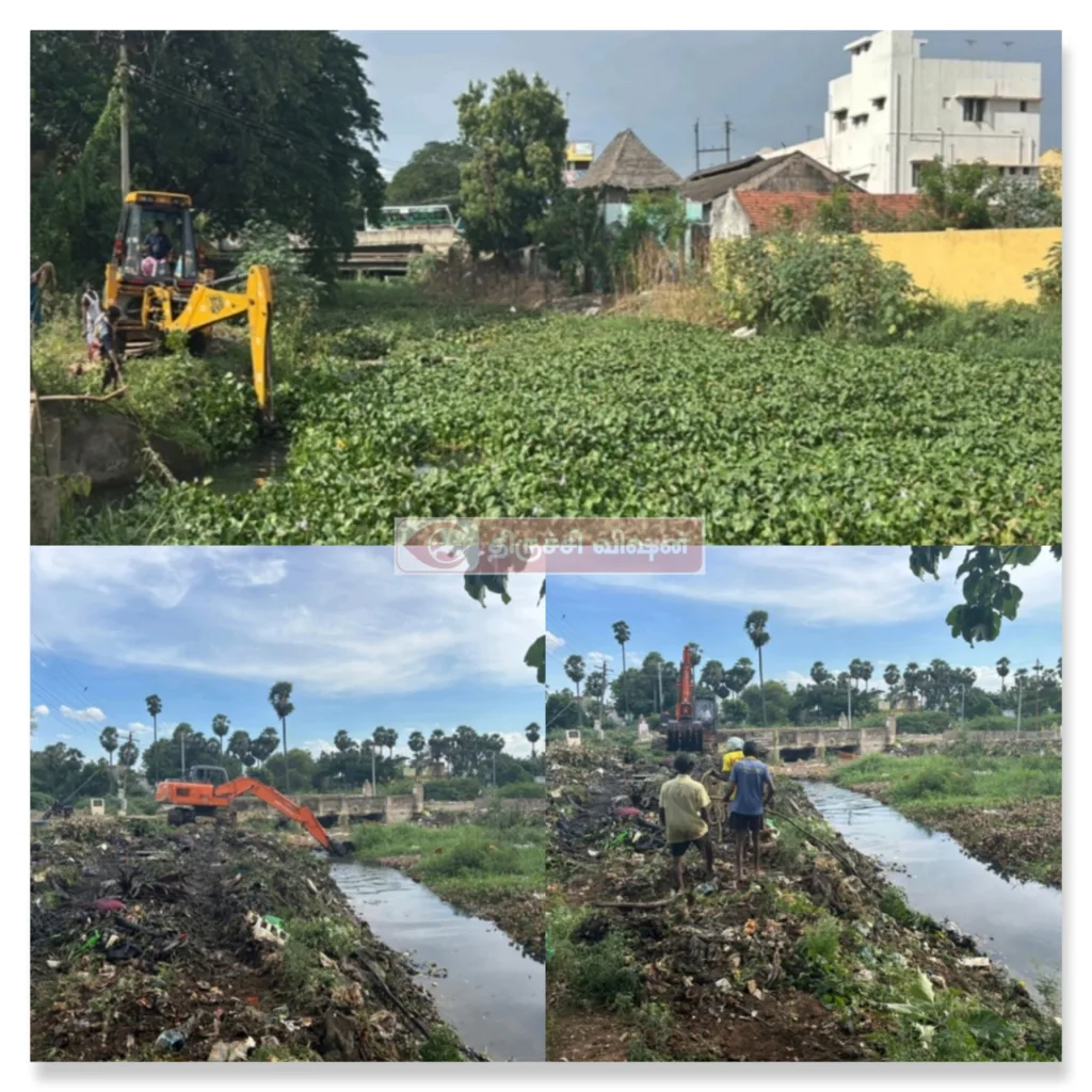 அரியமங்கலம், பாப்பாகுறிச்சி, மஞ்சதிடல், ஆலத்துர் மற்றும் கீழக்குறிச்சி ஆகிய பகுதிகளில் உள்ள உய்யக்கொண்டன் வாய்க்காலில் உள்ள பாலங்கள், மதகுகள் மற்றும் வெளிபோக்கிகளில் தேங்கியுள்ள குப்பைகள், ஆகாய தாமரை மற்றும் அல்லிக்கொடிகள் ஆகியவற்றை போர்கால அடிப்படையில் அகற்றும் பணி நடைபெற்று வருகிறது.