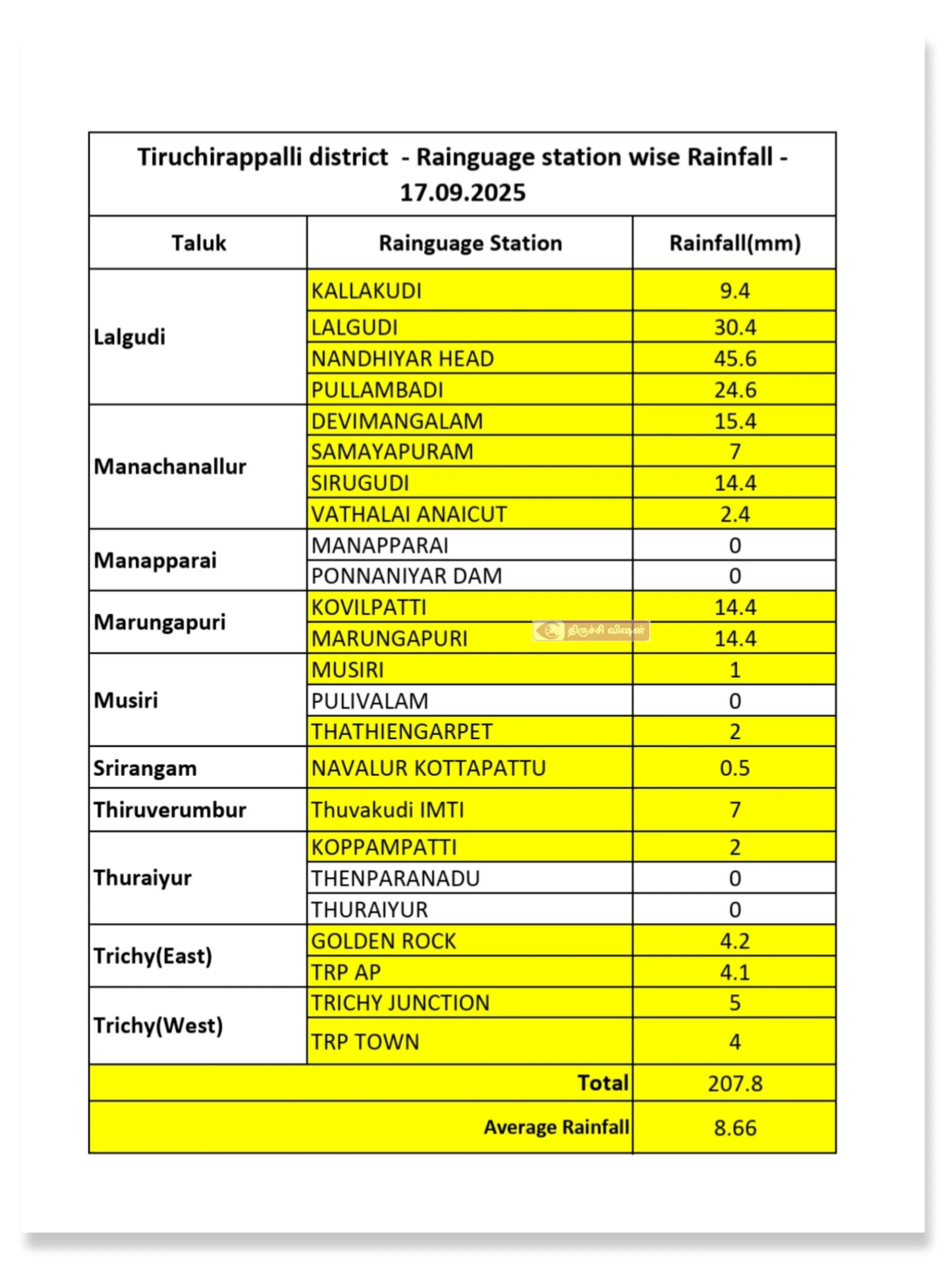 இன்று (17.09.2025) காலை நிலவரப்படி திருச்சி மாவட்டத்தில் 207.8 மிமீ மழை பதிவானது.