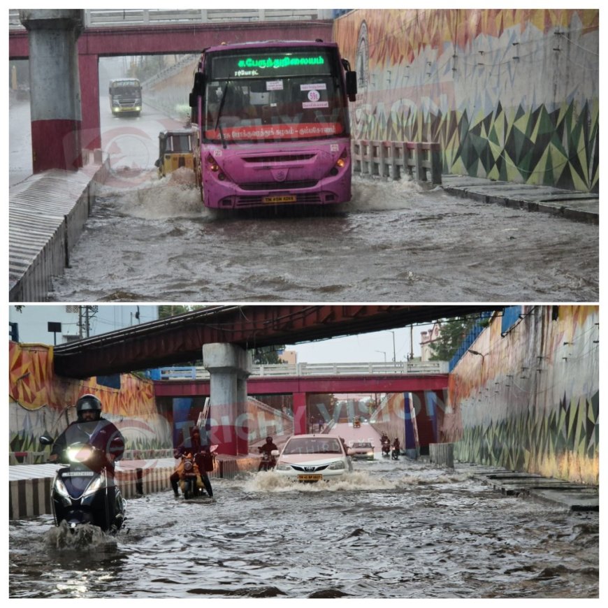 இதனால் மேலப்புதூர் சுரங்கப்பாதையில் 2 அடி உயரத்திற்கு மழை நீர் தேங்கி உள்ளது. பேருந்து மற்றும் நான்கு சக்கர வாகனங்கள் சுரங்கப்பாதை வழியாக செல்ல முடியாமல் சிரமப்பட்டன. ஒரு சில வாகனங்கள் மழைநீரில் தத்தளித்து கடந்து வந்தன. மாநகராட்சி ஊழியர்கள் மோட்டாரை வைத்து மழை நீரை வெளியேற்றும் பணியில் ஈடுபட்டு வருகின்றனர்.