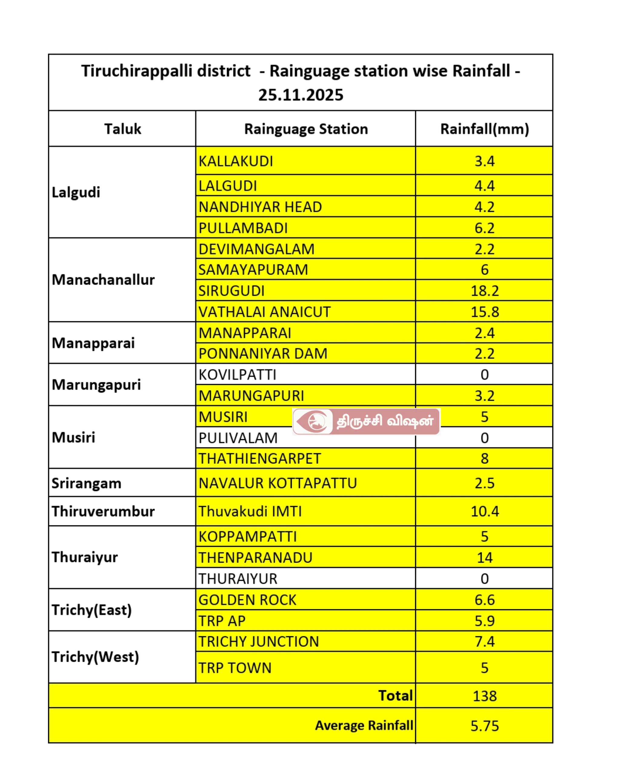 இன்று (25.11.2025) காலை நிலவரப்படி திருச்சி மாவட்டத்தில் 138 மிமீ மழை பதிவானது.