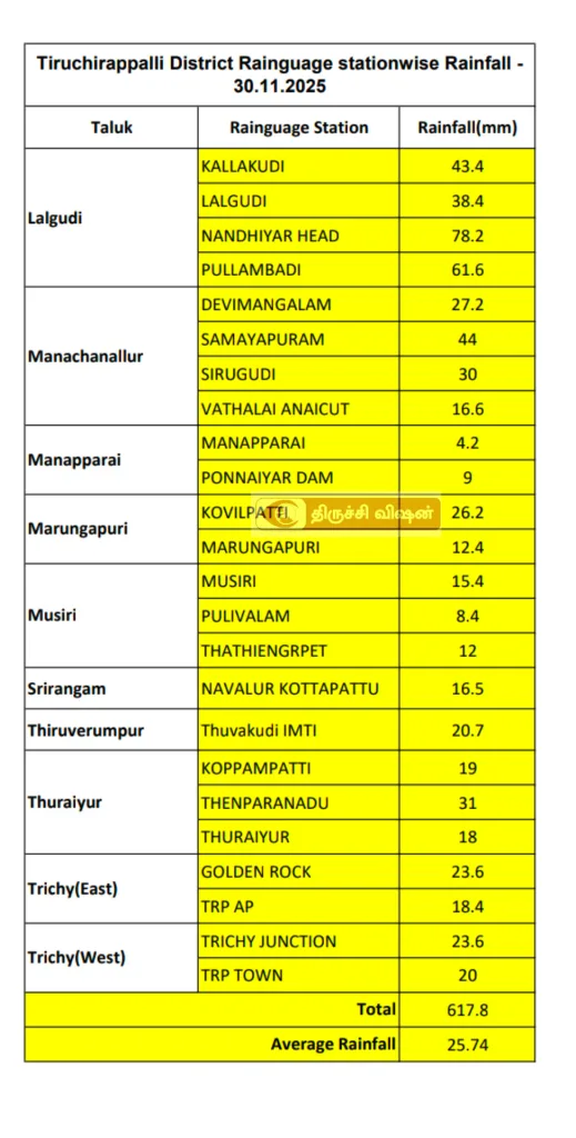 நவம்பர் 30, 2025 இன்று திருச்சிராப்பள்ளி மாவட்டத்தில் மொத்தமாக 617.8 மில்லிமீட்டர் (மி.மீ.) மழை பதிவாகியுள்ளது, இது மாவட்டத்தின் சராசரி மழை அளவான 25.74 மி.மீ.-ஐ விட அதிகமாகும்.
