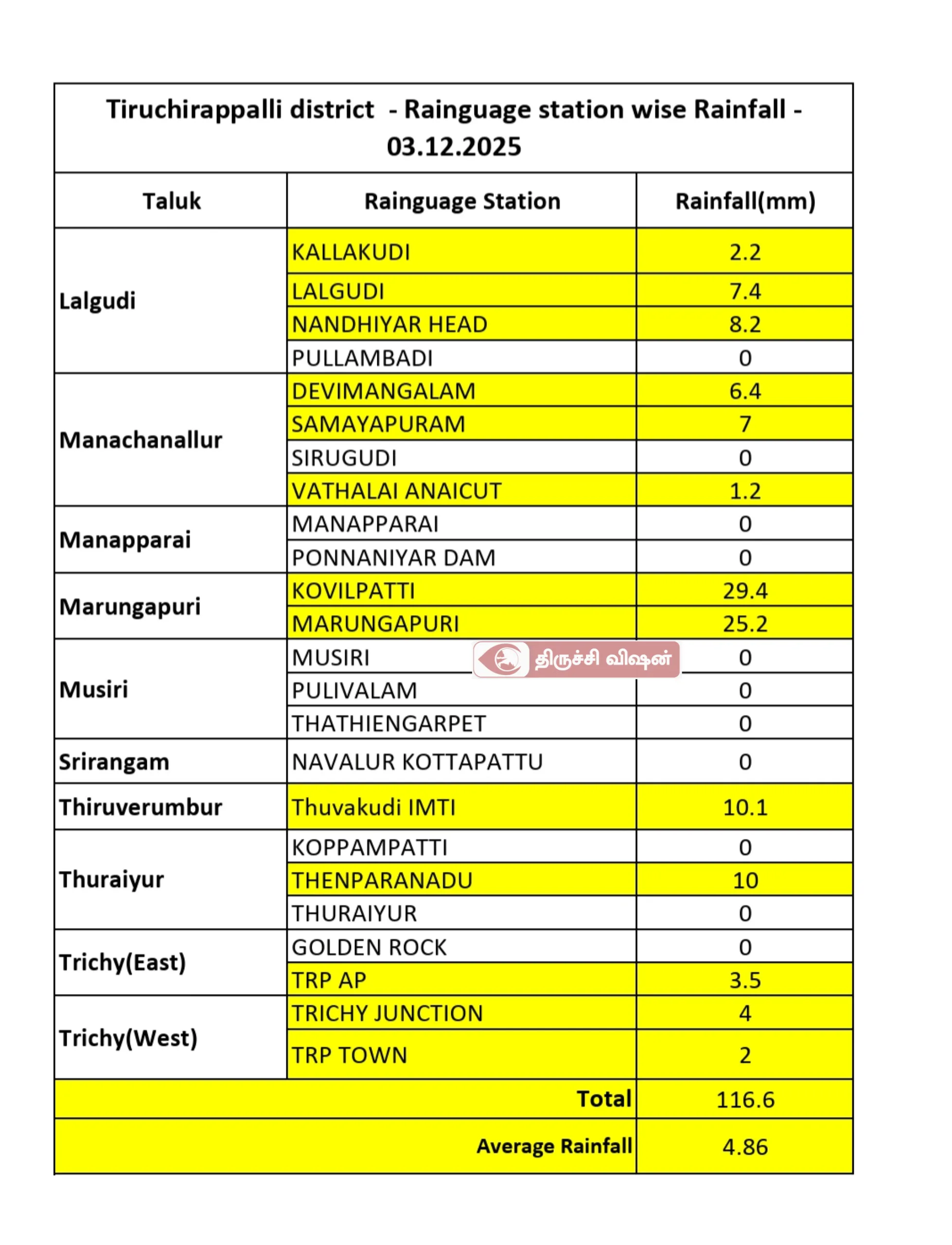 இன்று (03.12.2025) காலை நிலவரப்படி திருச்சி மாவட்டத்தில் 116.6 மிமீ மழை பதிவானது.
