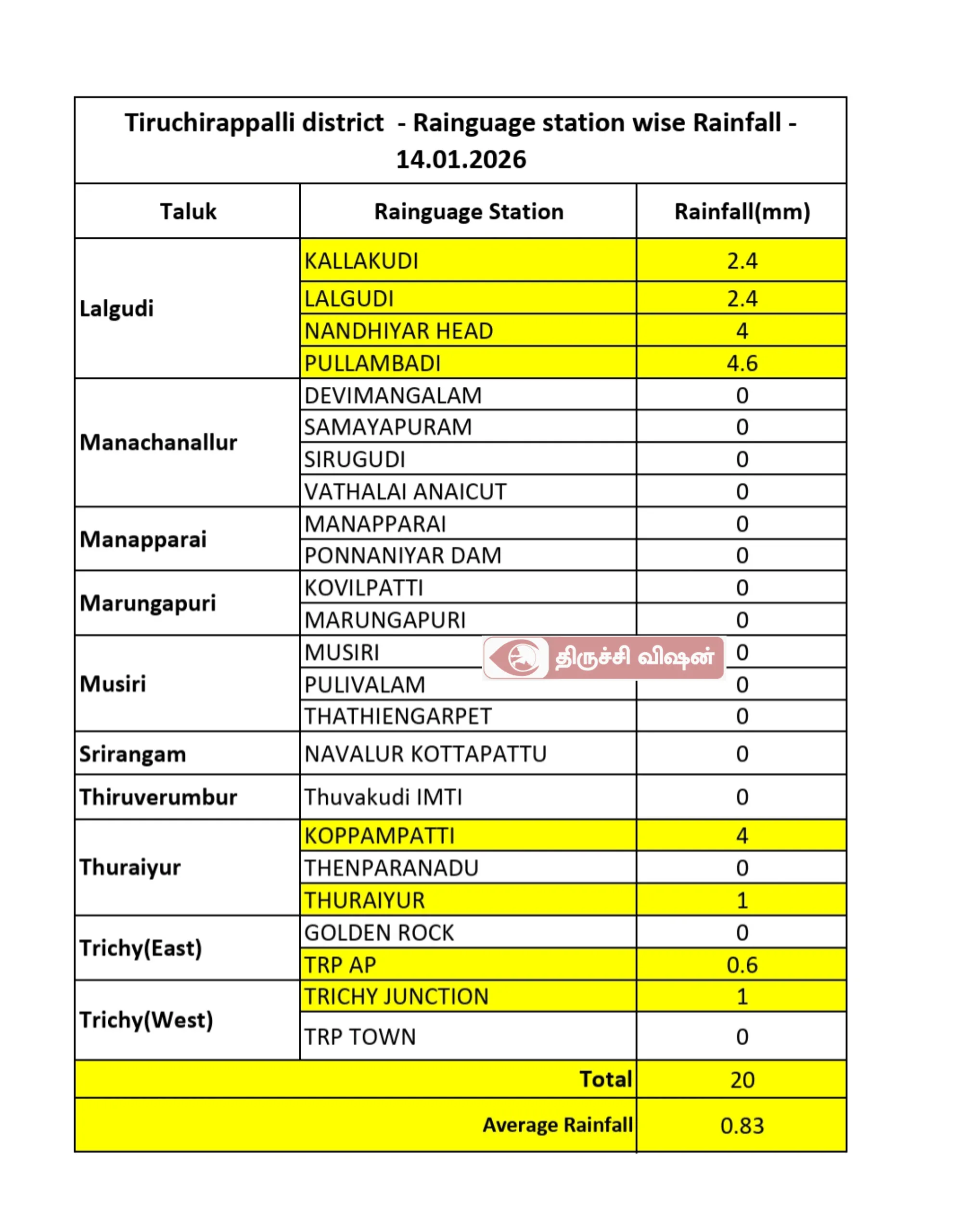 இன்று (14.01.2026) காலை நிலவரப்படி திருச்சி மாவட்டத்தில் 20 மிமீ மழை பதிவானது.