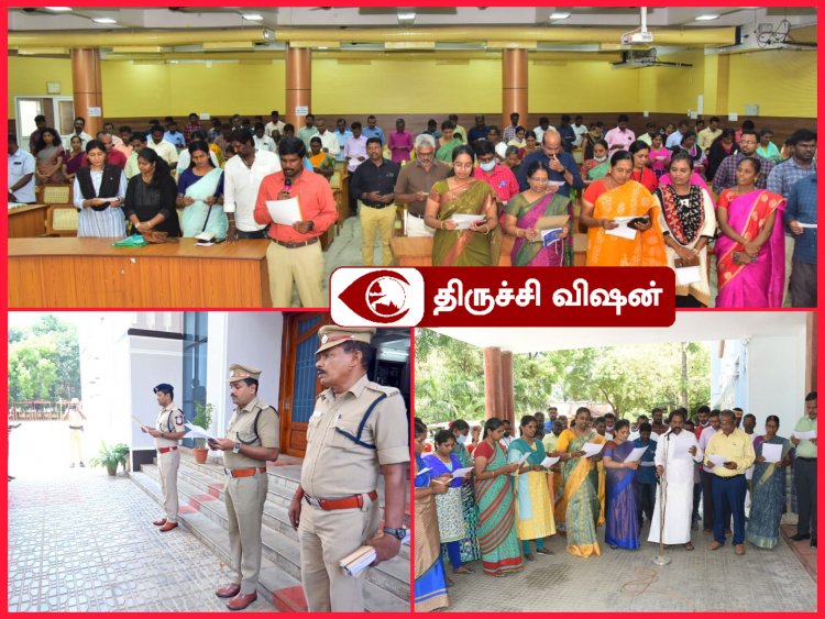 திருச்சிராப்பள்ளி மாவட்ட ஆட்சியரகத்தில் நல்லிணக்க நாள் உறுதி மொழியினை மாவட்ட ஆட்சித் தலைவர் பிரதீப் குமார் தலைமையில் இன்று அனைத்து அரசுத்துறை அலுவலர்களும் ஏற்றுக்கொண்டனர் இந்நிகழ்வில் மாவட்ட வருவாய் அலுவலர் அபிராமி உள்ளிட்ட அரசுத் துறை அலுவலர்கள் பங்கேற்றனர்.