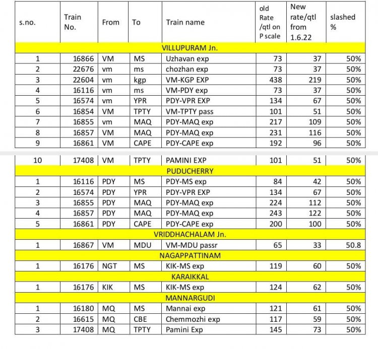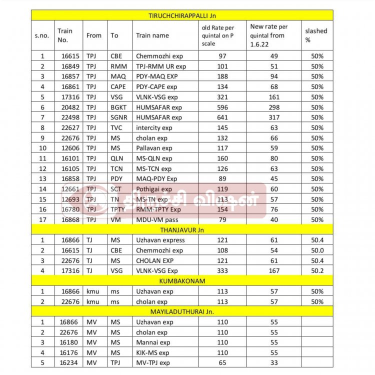 வெவ்வேறு பார்சல் கட்டணங்களுக்கான நான்கு அளவுகள் மற்றும் நான்கு தொடர்புடைய வகையான பார்சல் சேவைகள் ராஜ்தானி எக்ஸ்பிரஸ் ரயில்களில் ராஜ்தானி பார்சல் சேவைக்கான அளவிடும் ஆகும் மற்றும் மெயில் எக்ஸ்பிரஸ் ரயில்கள் சதாப்தி எக்ஸ்பிரஸ் ரயில்கள் மற்றும் பார்சல் எக்ஸ்பிரஸ் ரயில்களில் பார்சல் சேவை மற்றும் சாதாரண பயணிகள் ரயில்களின் பொருளாதார சேவைக்கான இது சம்பந்தமாக ரயில்கள் பின்வரும் தொடக்க ரயில்களுக்கான பார்சல் வகைப்பாடு குறைக்கப்பட்டுள்ளது. மேலும் சில ரயில்கள் வழியாக p அளவிலிருந்து S அளவு வரை செல்லும் இதன் விளைவாக 50 சதவீதம் கட்டணம் குறைக்கப்பட்டு உள்ளது. திருச்சிராப்பள்ளி ரயில்வே பார்சல் கட்டணம் குறைக்கப்பட்டுள்ளது. பார்சல்கொண்டு செல்லும் ரயில்களின் அல்லது பயன்பாட்டில் சதவீதத்தின் அடிப்படையில் நிர்ணயிக்கப்படுகின்றன. குறைக்கப்பட்ட பார்சல் கட்டணங்கள் உடனடியாக அமலுக்கு வரும் இந்த விலை குறைப்பு பயணிகளுக்கும் விற்பனையாளர்களுக்கும் ஒரே மாதிரியாக பயனளிக்கும். பார்சல் ஏற்றும் அளவும் பயணிகளின் ஆதரவும் கண்டிப்பாக உயரும் இந்த கட்டண குறைப்பு காரணமாக கீழே உள்ள அட்டவணையில் பட்டியலிடப்பட்டுள்ளன . ரயில்களில் ஏற்றப்படும் ஒரு குவிண்டாலுக்கு ஒரு பார்சலுக்கு வசூலிக்கப்படும் தொகை வேகமாக குறைக்கப்படும்.