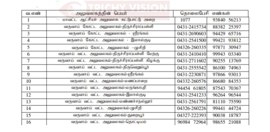 இது தொடர்பாக பொதுமக்களின் கோரிக்கைகளுக்கான தகவல்களை கீழ்காணும் உதவி மையங்களை நேரடியாகவும், கீழ்க்கண்ட தொலைபேசி எண்கள் மூலமாகவும் தொடர்பு கொண்டு பயன்பெறலாம் என்று திருச்சிராப்பள்ளி மாவட்ட ஆட்சித்தலைவர் மா.பிரதீப்குமார் தெரிவித்துள்ளார்.