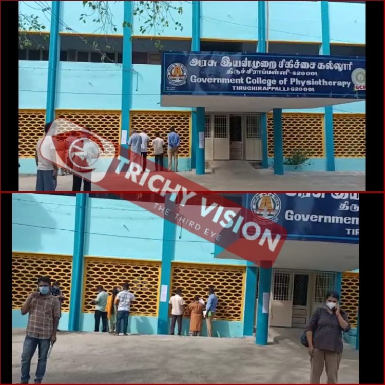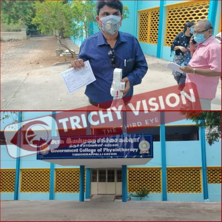 திருச்சியில் மாவட்ட ஆட்சியர் அலுவலகம் அருகே உள்ள இயன்முறை சிகிச்சை கல்லூரியில் ரெம்டெசிவிர் மருந்து முதலில் 2 பேருக்கு வழங்கி விற்பனை துவக்கம்.