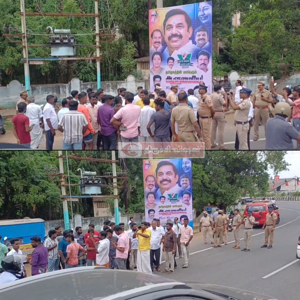திருச்சி புதுக்கோட்டை மெயின்ரோடு சுப்பிரமணியபுரத்தில் இன்று திருச்சிக்கு வருகை புரியும் கழகத்தின் பொதுச்செயலாளர் எடப்பாடி பழனிச்சாமி வரவேற்க வைக்கப்பட்டிருக்கும் பேனரை அகற்றுவதற்கு காவல் துறை நடவடிக்கை எடுப்பதால் ஏர்போர்ட் பகுதி கழகத்தின் சார்பாக இன்னும் சற்று நேரத்தில் சாலை மறியல் போராட்டம் நடைபெற இருக்கிறது.