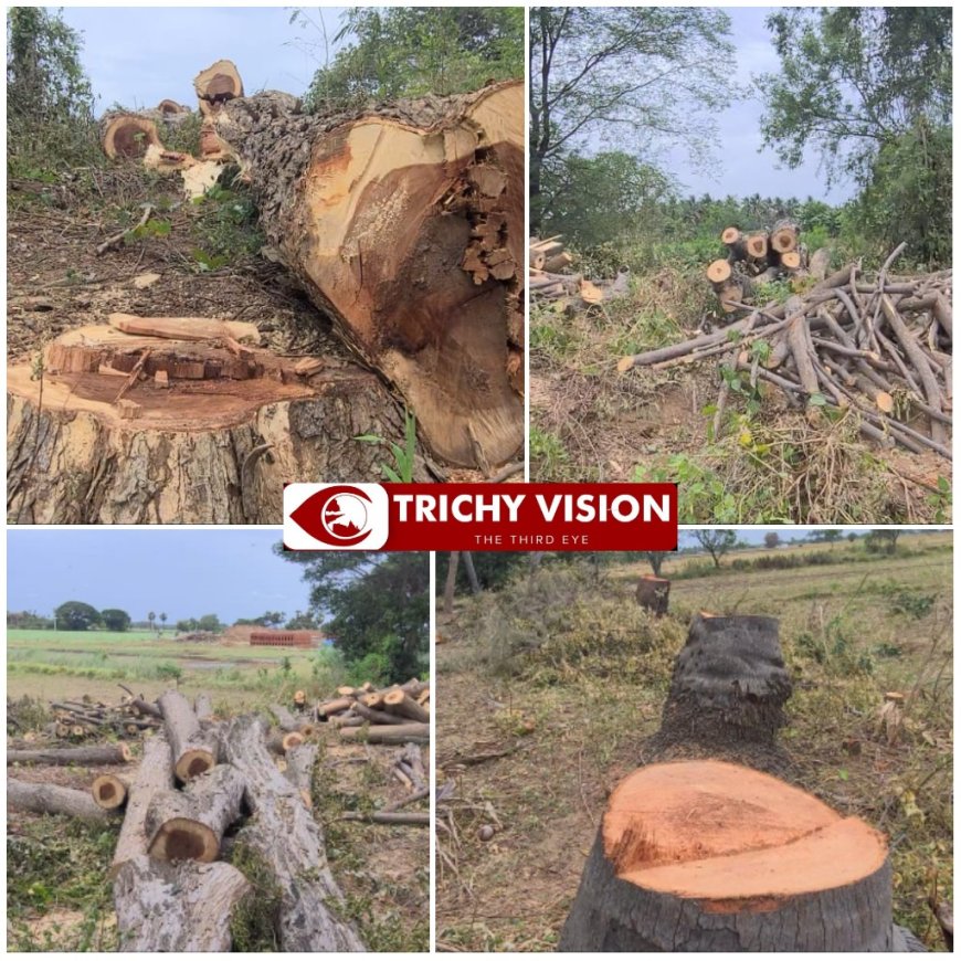திருச்சி மாவட்டம் லால்குடி அருகே எல். அபிஷேகபுரம் கிராம பகுதியில் கொடுவாய் வாய்க்கால் கரையோரம் இரண்டு பெரிய வாகை மரம் உள்ளது. இந்த மரங்களை மிஷின் கொண்டு மர்ம நபர்கள் மரத்தை துண்டு துண்டாக அறுத்து எடுத்துச் செல்வதற்கு முயன்றதாக கூறப்படுகிறது. இதுக்குறித்து அப்பகுதியில் உள்ள விவசாயிகள் லால்குடி வருவாய் கோட்டாட்சியரிடம் புகார் அளிக்கப்பட்டது.