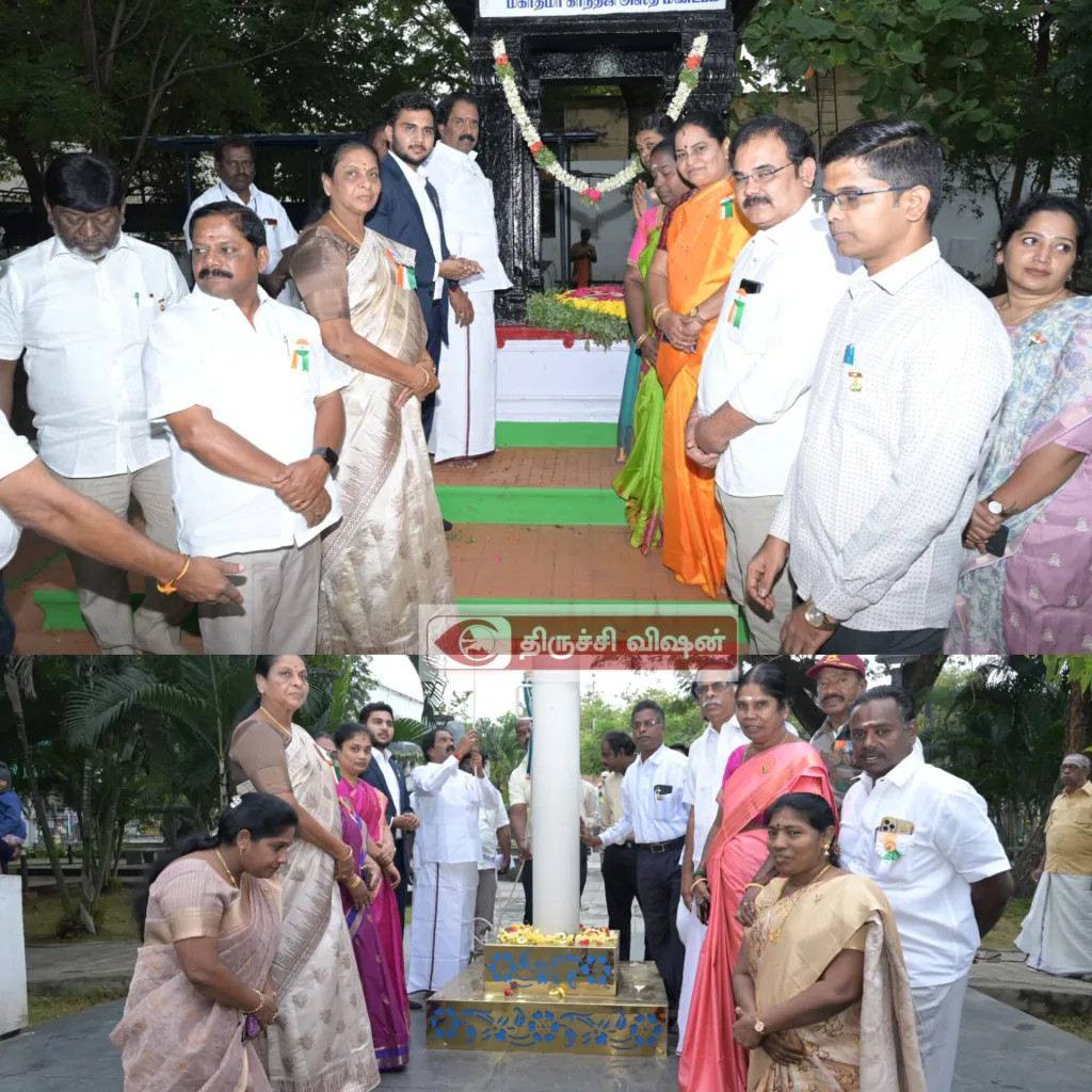பின்னர் அரசு தலைமை மருத்துவமணை அருகில் உள்ள அண்ணல் காந்தியடிகள் அஸ்தி மண்டபத்தில் மலர் வளையம் வைத்து மரியாதை செலுத்திய மாண்புமிகு மேயர் மு. அன்பழகன் அவர்கள், காந்திமார்கெட் போர் வீரர்கள் நினைவு தூணிற்கு மலர் வளையம் வைத்து மரியாதை செலுத்தி காந்தி சந்தை வளாகத்தில் உள்ள அண்ணல் காந்தியடிகள் திருவுருவ சிலைக்கு மாலை அணிவித்து தேசியக் கொடியை ஏற்றி வைத்து மரியாதை செலுத்தினார்.