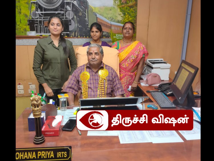 திருச்சியில் பணி ஓய்வு பெற்ற கடைநிலை ஊழியருக்கு, தனது இருக்கையில் அமரச் செய்து அருகில் நின்று பாராட்டு தெரிவித்துள்ளார் ரயில்வே உயர் அலுவலர் ஒருவர்.