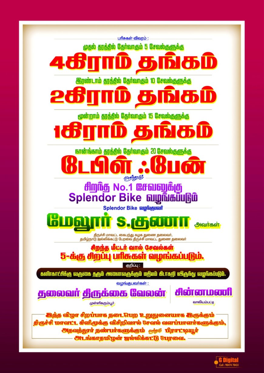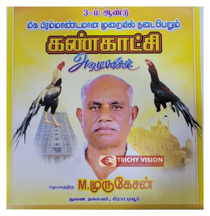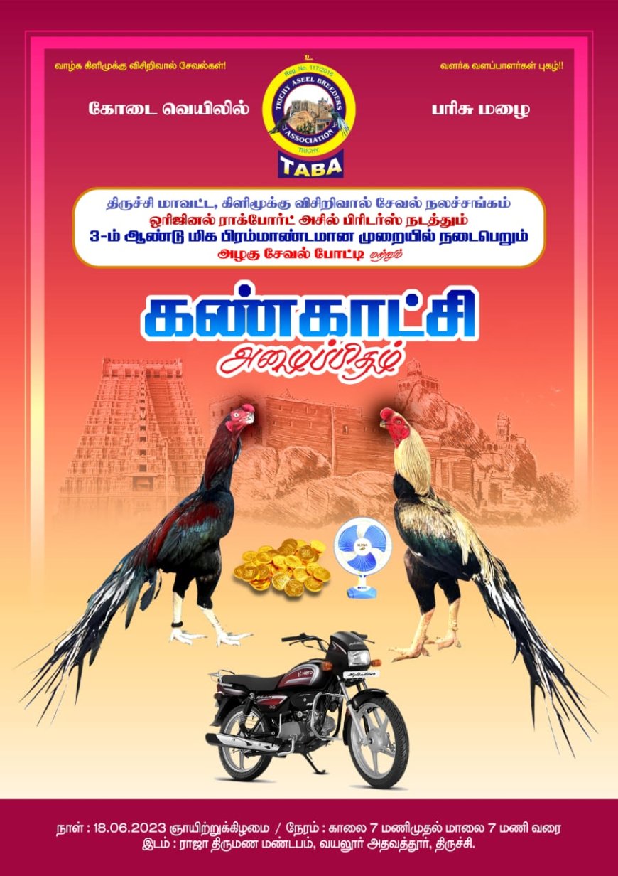 நாளை (18.06.2023) காலை 7 மணி முதல் மாலை 7 மணி வரை திருச்சி வயலூர் அதவத்தூர் ரோடு ராஜா திருமண மண்டபத்தில் நடைபெற உள்ளது. இந்த சேவல் போட்டி மற்றும் கண்காட்சியில் சிறப்பு விருந்தினராக ஸ்ரீரங்கம் சட்டமன்ற உறுப்பினர் பழனியாண்டி கலந்து கொள்ள உள்ளார்.