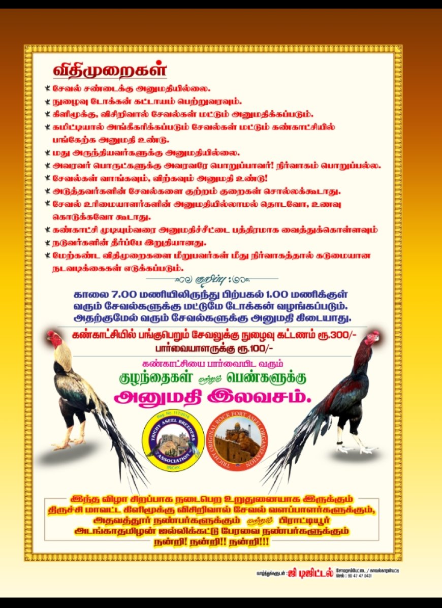 மேலும் போட்டி மற்றும் கண்காட்சியில் இடம்பெறக்கூடிய சேவல்களுக்கு நுழைவு கட்டணம் அறிவிக்கப்பட்டுள்ளது. போட்டியின் விதிமுறைகள் குறித்து கீழே உள்ள படத்தை பார்க்கவும்.