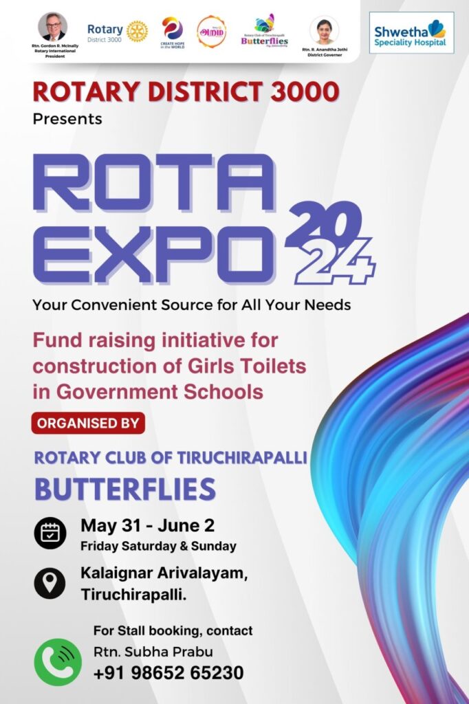 ரோட்டரி கிளப் ஆஃப் திருச்சிராப்பள்ளி பட்டர்ஃபிளைஸ் சார்பாக, வரவிருக்கும் கண்காட்சி நிகழ்வுக்கு ஸ்பான்சர்கள் தேவைப்படுகின்றனர். திருச்சி சத்திரம் பேருந்து நிலையத்தில் உள்ள கலைஞர் அறிவாலயத்தில் 2024 மே 31 முதல் 2024 ஜூன் 2 வரை நடைபெறும் Rota Expo 2024 கண்காட்சி அரசுப் பள்ளிகளில் பெண் குழந்தைகளுக்கான கழிப்பறைகள் கட்ட நிதி திரட்டுவதை நோக்கமாகக் கொண்டுள்ளது. இந்த முயற்சி நமது சமூகத்தில் கல்வி மற்றும் சுகாதாரத்தை மேம்படுத்துவதற்கானதாகும். ஒவ்வொரு பெண்ணும் பள்ளியில் பாதுகாப்பான மற்றும் சுகாதாரமான சுகாதார வசதிகளை அணுகுவதை உறுதிசெய்கிறது.