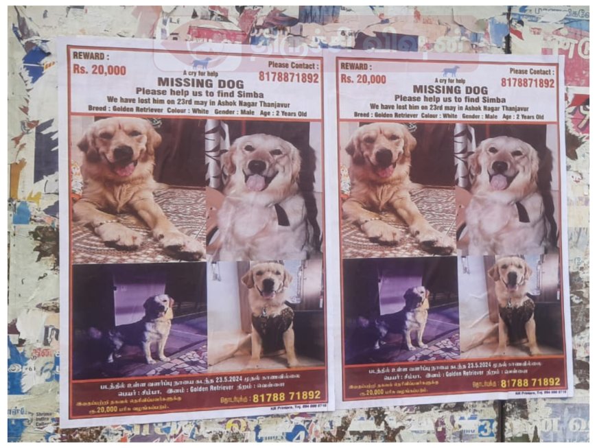 தஞ்சாவூர் மாநகரில் கடந்த இரு தினங்களாக நகரின் பல்வேறு இடங்களில் நாய் புகைப்படத்துடன் கூடிய சுவரொட்டி ஒட்டப்பட்டுள்ளது. அதில், “படத்தில் உள்ள வளர்ப்பு நாயை கடந்த (23.05.2024) முதல் காணவில்லை. நாயின் பெயர் சிம்பா, கோல்டன் ரெட்ரீவர் வகையைச் சார்ந்த, வெள்ளை நிறத்திலான இரண்டு வயதுடைய நாய்.
