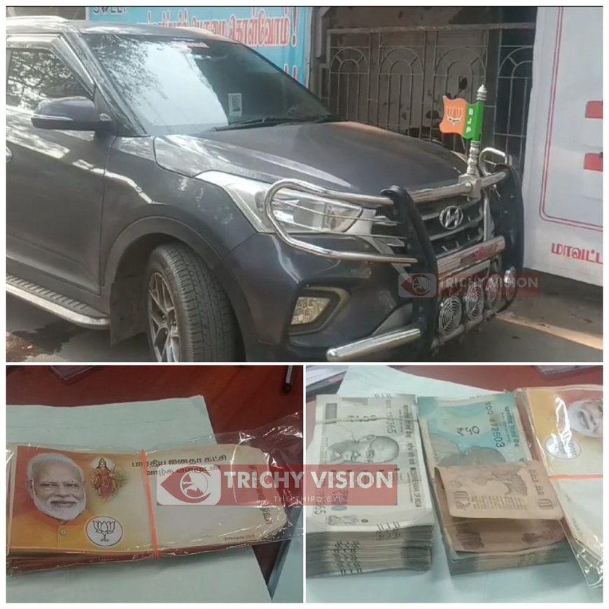 பாஜக கொடி கட்டிய காரில் ரூபாய் 75860 பணம் மற்றும் பிரதமர் மோடியின் உருவம் பதித்த கவர் பறிமுதல்