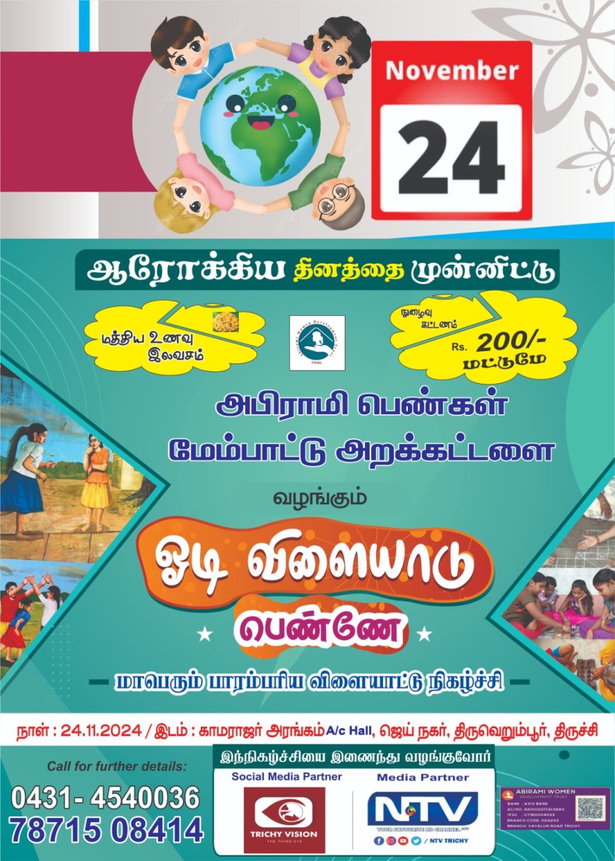 ஆரோக்கிய தினத்தை முன்னிட்டு அபிராமி பெண்கள் மேம்பாட்டு அறக்கட்டளை வழங்கும் ஓடி விளையாடு பெண்ணே மாபெரும் பாரம்பரிய விளையாட்டு நிகழ்ச்சி நடைபெற உள்ளது.