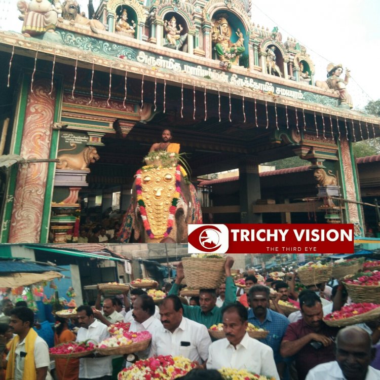 அதன்படி இன்று காலை விக்னேஷ்வரா பூஜை மற்றும் காப்புக்கட்டுதலுடன் பூச்செரிதல் விழா கோலாகலமாக துவங்கியது. கோவில்நிர்வாகத்தின் சார்பில் சமயபுரம் கோவில் இணை ஆணையர் கல்யாணி தலைமையில் நிர்வாகத்தினர், கிராமமக்கள் உள்ளிட்டோர் யானை மீதும், அவரவர் தலையில் பூந்தட்டுகளை சுமந்து  கோயில் நான்கு மாட வீதியில் வலம் வந்து ஆலயத்தை வந்தடைந்து.
