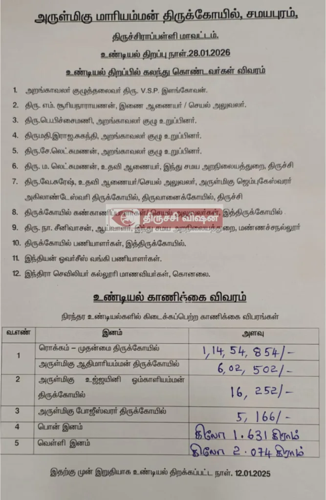 திருச்சிராப்பள்ளி மாவட்டத்தில் உள்ள புகழ்பெற்ற சமயபுரம் அருள்மிகு மாரியம்மன் திருக்கோயிலில் இன்று (28.01.2026) உண்டியல் திறக்கப்பட்டு காணிக்கைகள் எண்ணப்பட்டன. இந்த நிகழ்வில் அறங்காவலர் குழுத் தலைவர் திரு. V.S.P. இளங்கோவன், இணை ஆணையர்/செயல் அலுவலர் திரு. எம். சூரியநாராயணன் மற்றும் இந்து சமய அறநிலையத்துறை அதிகாரிகள் முன்னிலை வகித்தனர். இதற்கு முன் இறுதியாக   12.01.2026 அன்று  உண்டியல் திறக்கப்பட்ட நிலையில், நீண்ட இடைவேளைக்குப் பிறகு இன்று நடைபெற்ற இந்த பணியில் வங்கிப் பணியாளர்கள் மற்றும் கல்லூரி மாணவிகள் எனப் பலர் கலந்து கொண்டனர்.
