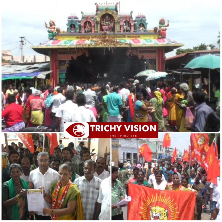 திருச்சி மாவட்டம், அருள்மிகு சமயபுரம் மாரியம்மன் கோவில் நிர்வாகத்தை கண்டித்து நாம் தமிழர் கட்சியினர் சமயபுரம் நால்ரோடு முதல் சமயபுரம் மாரியம்மன் கோவில் இணை ஆணையர் அலுவலகம் வரை பேரணியாக வந்து சமயபுரம் மாரியம்மன் கோவில் இணை ஆணையர் அலுவலகத்தில் மனு அளித்தனர்.