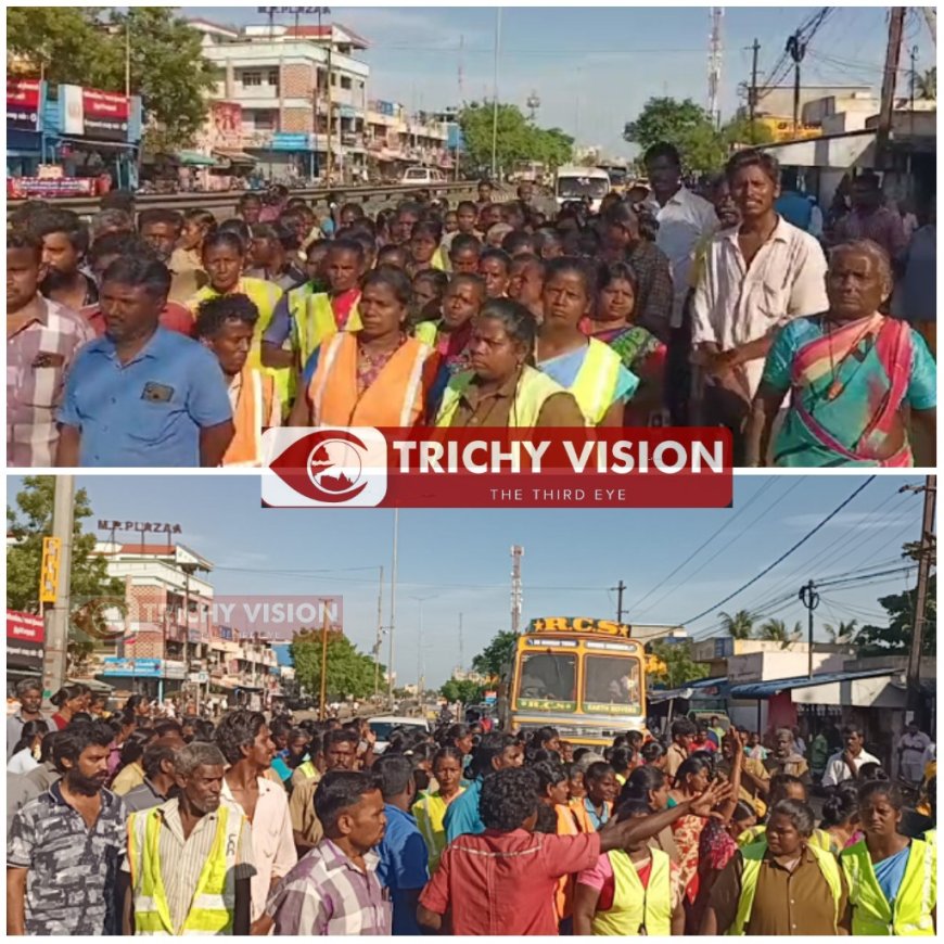 கொரோனா காலம் முதல் தற்போது வரை தொடர்ந்து தூய்மை பணியில் தங்களை அர்ப்பணித்து பணியாற்றிவரும் தூய்மை பணியாளர்களை எவ்வித முன்னறிவிப்பும் இன்றி நீக்கம் செய்ததை கண்டித்து இன்றைய தினம் 200க்கும் மேற்பட்ட ஒப்பந்த தூய்மை பணியாளர்கள் திருச்சி – தஞ்சை சாலையில் திடீர் சாலை மறியலில் ஈடுபட்டனர்.
