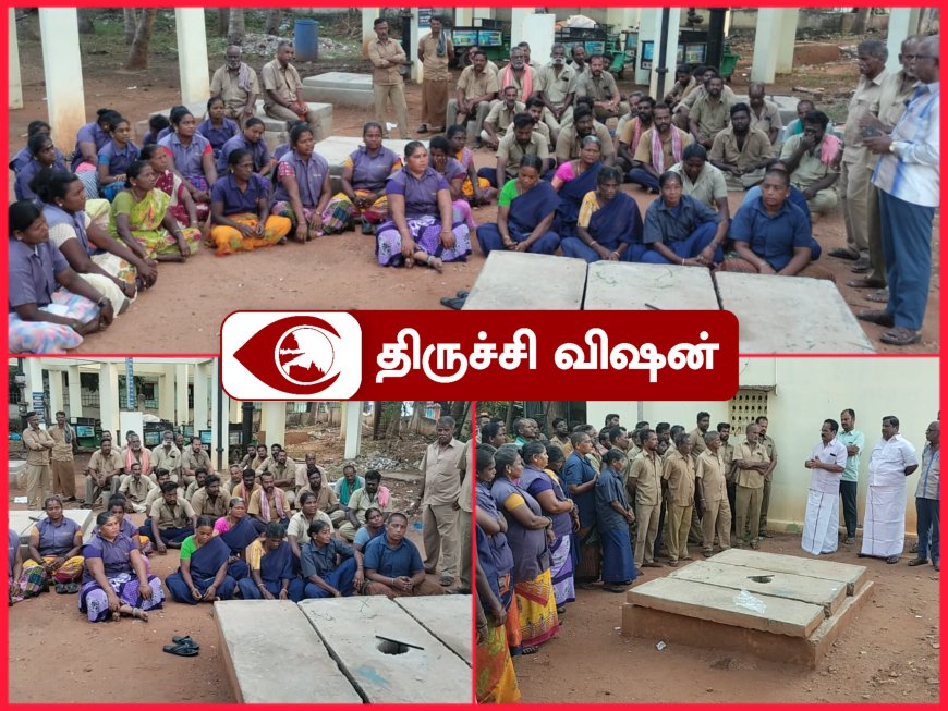 மணப்பாறை நகராட்சியில் பணிபுரியும் திருச்சி மாவட்ட உள்ளாச்சி தொழிலாளர்கள் ஏ.ஐ.டி.யூ.சி. சங்க தூய்மை பணியாளர்கள் ஒப்பந்த பணியாளர்கள் பதினைந்து பேரை வேலை நிறுத்தம் செய்ததை கைவிடவும் நிரந்தர பணியாளர்களுக்கு கூடுதல் பணிசுமை ஏற்படுத்துவதை கைவிடவும் குப்பைகளை எடைபோட்டு வங்கும் முறையை கைவிட வலியுறுத்தி உள்ளியிருப்பு வேலை நிறுத்த போராட்டத்தில் ஈடுபட்டனர்.