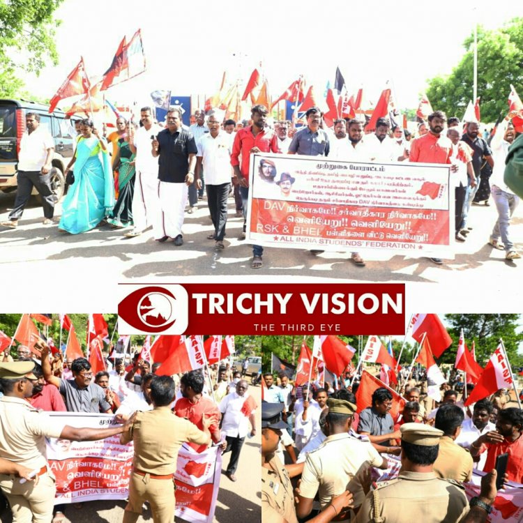 இந்த நிலையில் பள்ளியில் தமிழ் பாடத்தை தடை செய்யும் போக்கு, இந்தி மொழி திணிப்பு, சிப்ட் முறையில் வகுப்புகள் ஆகியவற்றை கண்டித்து அனைத்திந்திய மாணவர் பெருமன்ற திருவெறும்பூர் ஒன்றிய தலைவர் கபிலன் தலைமையில் ஆர் எஸ் கே பள்ளியை முற்றுகையிட்டு போராட்டத்தில் ஈடுபட்டனர். போராட்டத்தின் போது போலீசாருக்கும் போராட்டக்காரர்களுக்கும் இடையே தள்ளுமுள்ளு ஏற்பட்டது.