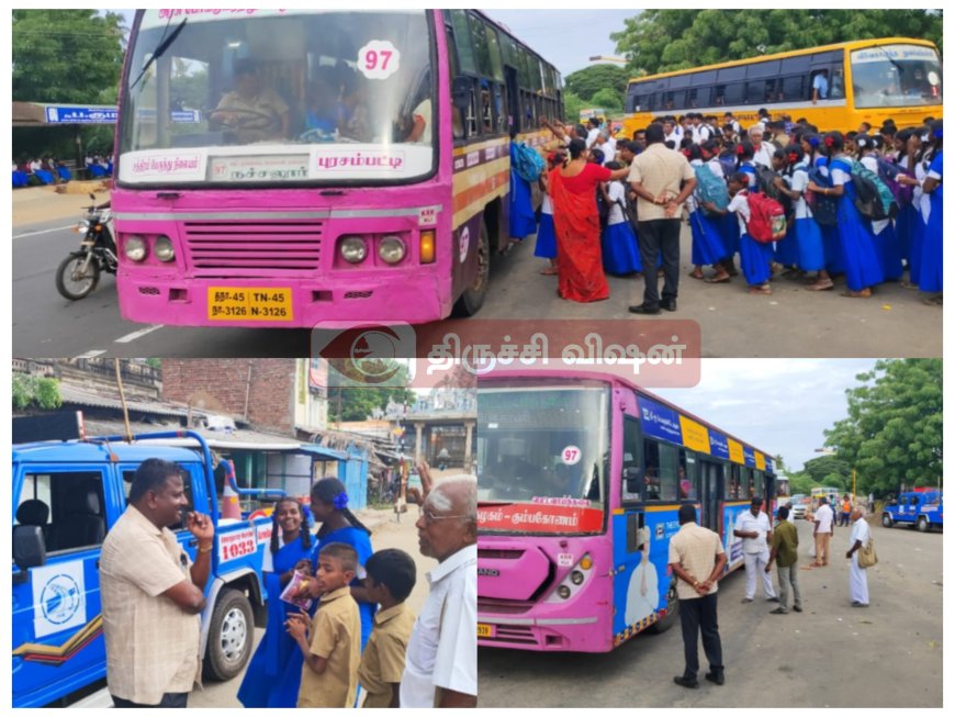 அப்போது பொது மக்களின் கருத்துக்களை கேட்டறிந்து கொண்டனர். அதனை தொடர்ந்து இன்றுவரை பள்ளி மாணவர்களின் நலனை கருத்தில் கொண்டு குளித்தலை பணிமனை மேலாளர் ராஜேந்திரன் தலைமையில் பணியாளர்கள் இன்று வரை மாணவ மாணவியர்களை பேருந்துளில் வரிசை படியாக நின்று ஏற்றி விட்டும், பள்ளி விடும் நேரங்களில் கூடுதல் பேருந்துகளை இயக்கியும் , அரசு அலுவலர்களின் கண்காணிப்பு பணிகளும், சாலை பாதுகாப்பு பணிகளும் தொடர்ந்து வருகிறது.