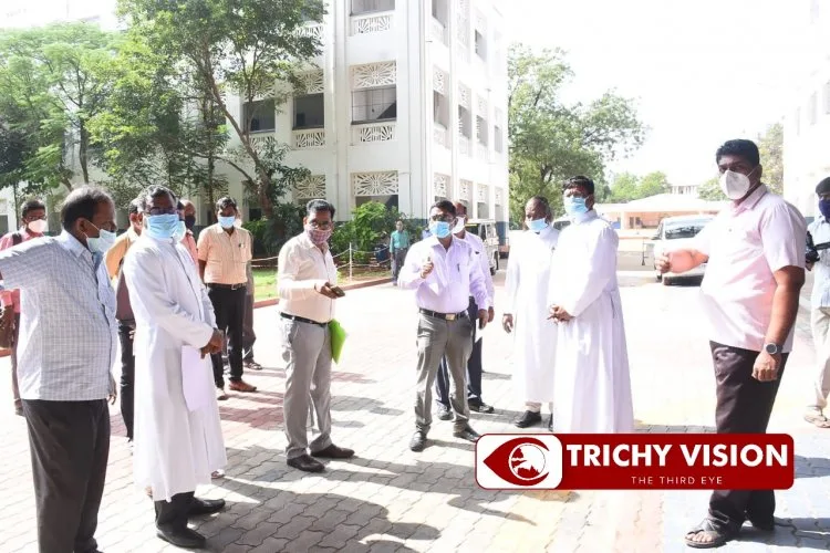 பள்ளிகளில் அரசு விதிமுறைகளை பின்பற்றி உள்ளார்களா என்பது குறித்து மாநகராட்சி அலுவலகம் எதிரே உள்ள தனியார் பள்ளியில் உடல் நலம் சுகாதாரம் மற்றும் பாதுகாப்பு குறித்து திருச்சி மண்டல தலைவரும், ஆசிரியர் தேர்வு வாரியத் தலைவருமான நிர்மல்ராஜ், மாவட்ட ஆட்சியர் சிவராசு, மாவட்ட முதன்மை அலுவலர் அறிவழகன் உள்ளிட்ட அதிகாரிகள் ஆய்வு செய்தனர்.