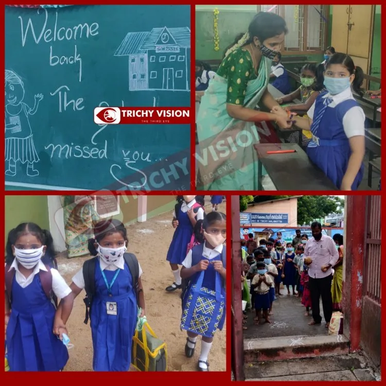 திருச்சி மாவட்டத்தில் 1200 க்கும் மேற்பட்ட பள்ளிகள் 1ம் வகுப்பு முதல் எட்டாம் வகுப்பு வரை உள்ள வகுப்புகள் ஆறு நூறு நாட்களுக்குப் பிறகு திறக்கப்பட்டடுள்ளது. இதையொட்டி திருச்சி தென்னூர் சுப்பையா நடுநிலைப்பள்ளி தலைமையாசிரியர் ஜீவானந்தம் பள்ளிக்கு வரக்கூடிய மாணவர்களுக்கு மலர்கள் கொடுத்து வரவேற்றார்.
