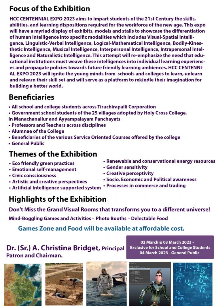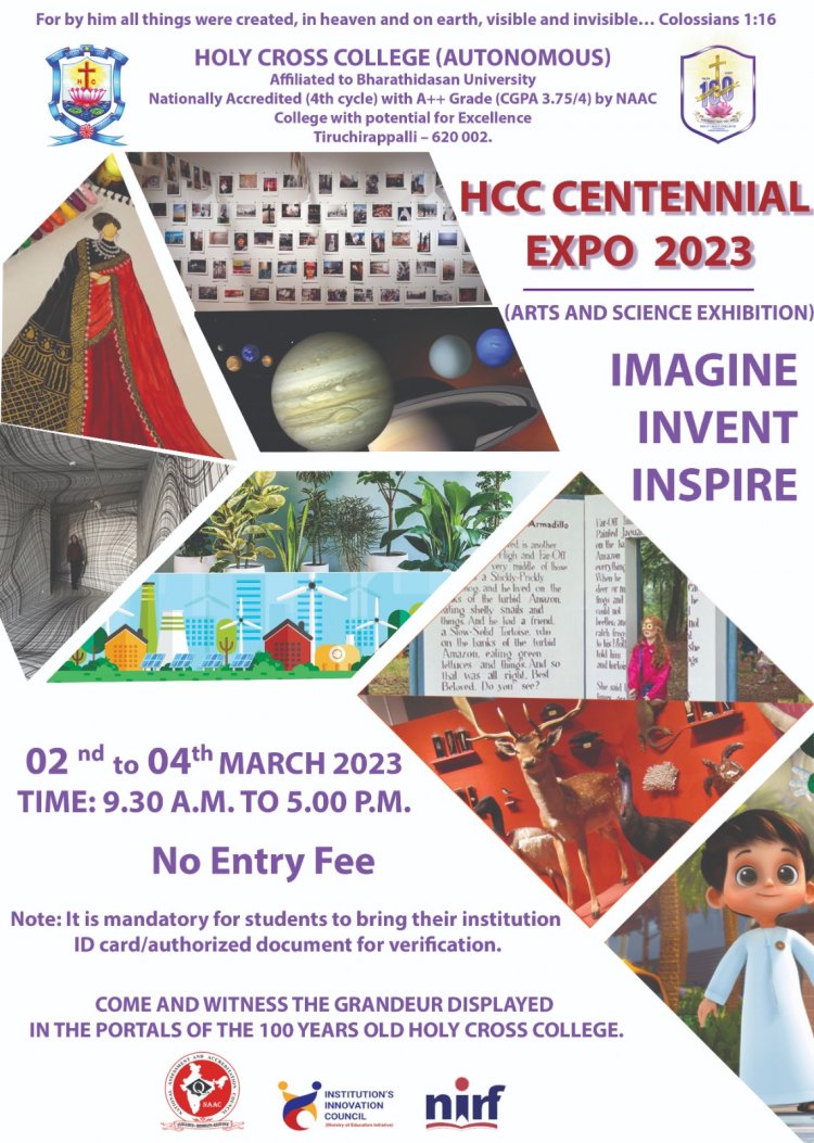 திருச்சிராப்பள்ளி ஹோலி கிராஸ் கல்லூரியின் நூற்றாண்டு ஆண்டை முன்னிட்டு இமேஜின்- இன்வென்ட்- இன்ஸ்பயர்’ என்ற கருத்துடன் HCC CENTENNIAL EXPO 2023 கலை மற்றும் அறிவியல் கண்காட்சி 2023 மார்ச் 2 முதல் 4 வரை நடைபெறுகிறது.