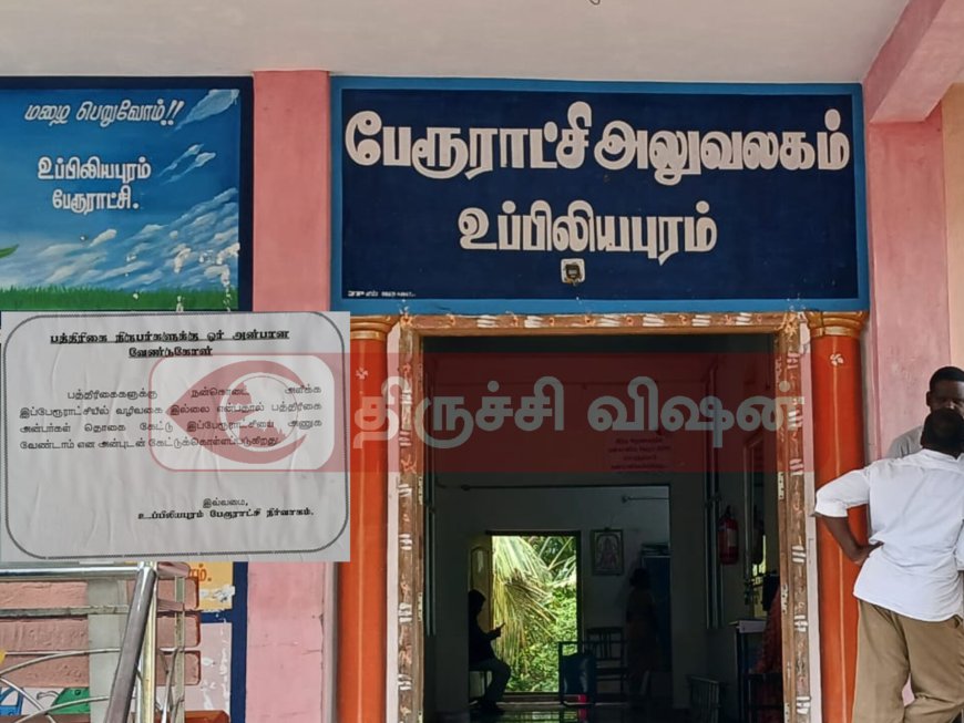 தீபாவளிக்காக பத்திரிக்கையாளர்கள் நன்கொடை கேட்டு வர வேண்டாம் அவர்களுக்கு கொடுக்கும் அளவுக்கு இப் பேரூராட்சியில் வழிவகை இல்லை என்றும் இப்படிக்கு உப்பிலியபுரம் பேரூராட்சி நிர்வாகம் என வாசலில் போஸ்டரை ஒட்டி வைத்துள்ளனர்.