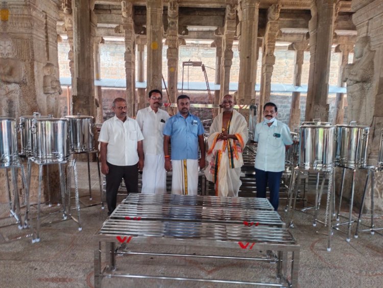 ஸ்ரீரங்கம் அருள்மிகு அரங்கநாதசுவாமி கோயிலில் ரூபாய் 100 கட்டண தரிசனம், கட்டணமில்லா தரிசனம் வரிசையில் செல்லும் பக்தர்கள் காத்திருக்கும் போது அமர்வதுக்காக திருச்செங்கோடு விவேகானந்தா கல்லூரிகளின் குழுமத் தலைவர் எம்.கருணாநிதி ரூபாய் ஏழு லட்சத்து இருபதாயிரம் மதிப்புடைய 60 சில்வர் மேசைகளையும்,