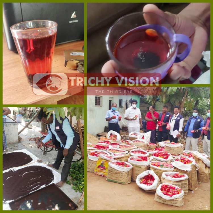 திருச்சிராப்பள்ளி உணவு பாதுகாப்புதுறை மாவட்ட நியமன அலுவலர் Dr. ரமேஷ்பாபு அவர்கள் தலைமையில் உணவு பாதுகாப்பு அலுவலர்கள் கொண்ட குழு திருச்சிராப்பள்ளி அரியமங்கலம் திருமகள் தெருவில் செல்வின் என்பவருடைய வீட்டை ஆய்வு செய்யும்போது சுமார் 1000 கிலோ கலப்பட தேயிலை தூள் கண்டறியப்பட்டு வழக்கு தொடுப்பதற்காக மூன்று சட்டபூர்வ உணவு மாதிரி எடுக்கப்பட்டும், அதனை பறிமுதல் செய்து பிணை பத்திரம் போடப்பட்டு அவரது வீட்டில் ஒரு அறையில் சீல் வைக்கப்பட்டுள்ளது.