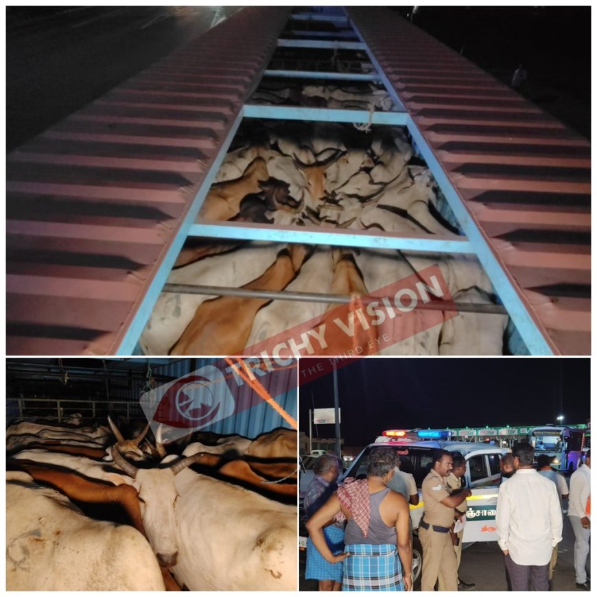 பின்னர் திருச்சி சமயபுரம் சுங்கச்சாவடியில் ஆந்திர மாநிலம் பதிவேடு கொண்ட லாரியை பிடித்து சோதனை செய்தனர். அப்போது அளவுக்கு அதிகமாக கண்டெய்னர் லாரியில் இருந்த மாடுகளை பறிமுதல் செய்த சமயபுரம் போலீசார் வழக்கு பதிவு செய்து விசாரணை நடத்தி வருகிறார்கள்.