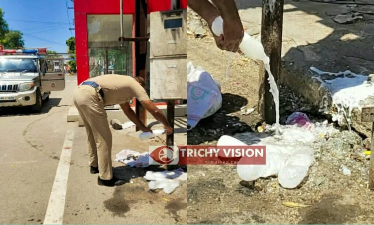 உடனே அவர்கள் வைத்திருந்த பையை போட்டு விட்டு, தப்பி ஓடிவிட்டனர். ரோந்து போலீசார் பையை எடுத்து சோதனை செய்த போது, ஒரு லிட்டர் வாட்டர் பாட்டில் 7 பாட்டில்களில், தடை செய்யப்பட்ட கள் இருப்பதும், அதில் ஒரு பாட்டிலில் இருந்த கள் புளித்து, அதிலிருந்து வெளியான கேஸ் காரணமாக பாட்டில் வெடித்தது தெரியவந்தது. போலீசார், அந்த கள்ளை கீழே ஊற்றி அழித்ததோடு, தப்பி ஓடிய இருவரை போலீசார் தேடி வருகின்றனர்.