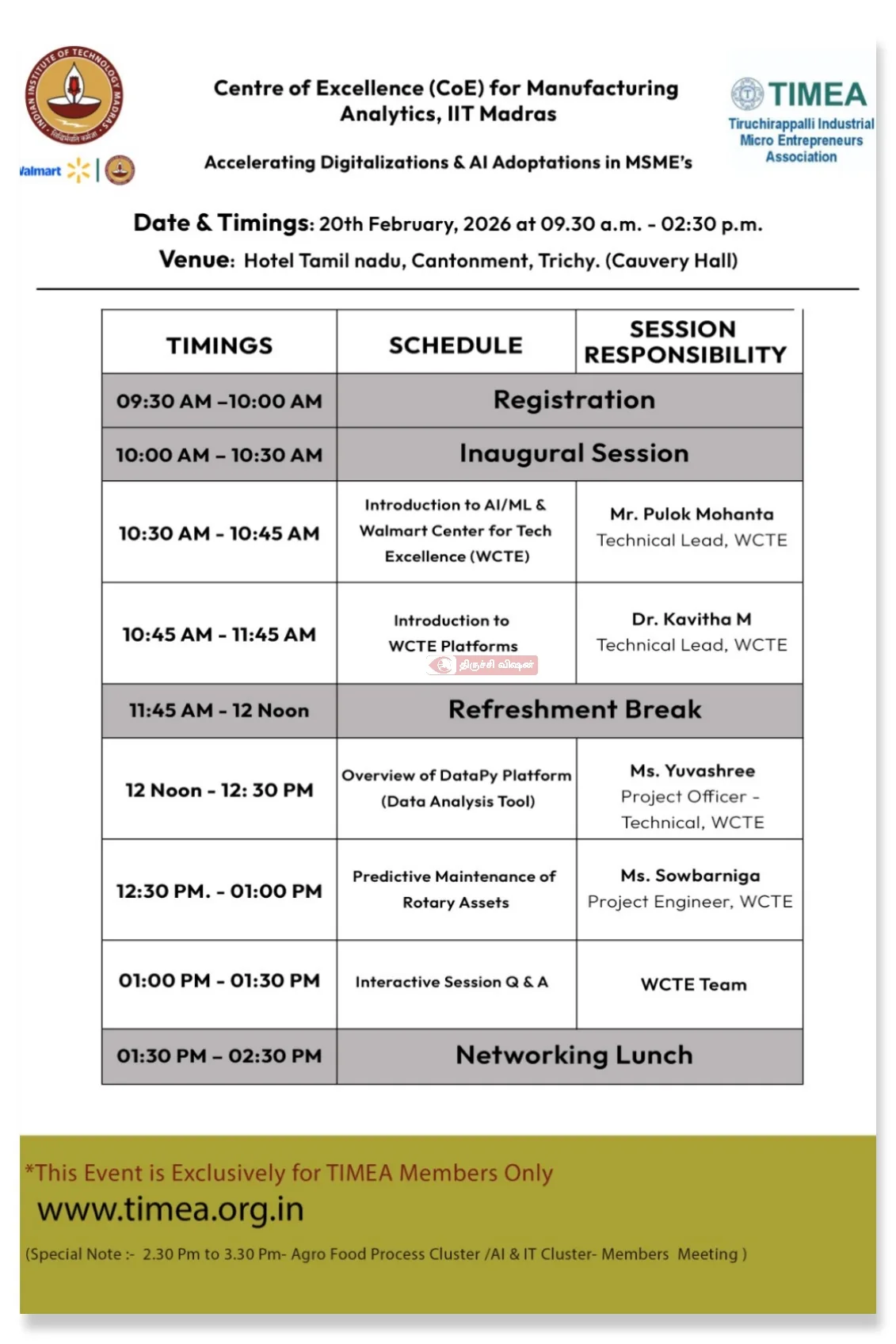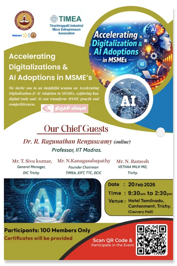 திருச்சிராப்பள்ளி தொழிற்துறை மைக்ரோ தொழில்முனைவோர் சங்கம் (TIMEA) சார்பில், MSME நிறுவனங்களில் டிஜிட்டல் மாற்றமும் செயற்கை நுண்ணறிவு (AI) பயன்பாடுகளும் குறித்த விழிப்புணர்வு கருத்தரங்கம் 20 பிப்ரவரி 2026 அன்று நடைபெறுகிறது.