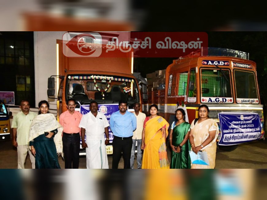 திருச்சிராப்பள்ளி மாவட்ட ஆட்சியர் அலுவலக வளாகத்தில் நடைபெற்ற நிகழ்ச்சியில் மாவட்ட ஆட்சித்தலைவர் மா.பிரதீப் குமார் சென்னை மற்றும் அருகில் உள்ள மாவட்டங்களில் மிக்ஜாம் புயல் மழையினால் பாதிக்கப்பட்ட பகுதிகளுக்கு ரூ.1 கோடி மதிப்பிலான வெள்ள நிவாரண பொருட்களை மாவட்ட நிர்வாகத்தின் சார்பில் 8 லாரிகள் மூலம் சென்னைக்கு வழியனுப்பி வைத்தார்.