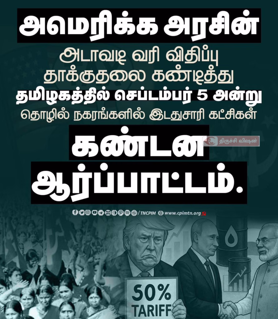 அமெரிக்க அரசின் அடாவடி வரி விதிப்பு தாக்குதலை கண்டித்து தமிழகத்தில் செப்டம்பர் 5 அன்று தொழில் நகரங்களில் இடதுசாரி கட்சிகள் கண்டன ஆர்ப்பாட்டம் என்ற முடிவின்படி இன்று திருச்சி மாநகர் மாவட்ட இடதுசாரி கட்சிகளின் ஒருங்கிணைப்பு குழு கூட்டம் 29.08.2025 மாலை இந்திய கம்யூனிஸ்ட் கட்சி மாவட்டக் குழு அலுவலகம் மாணிக்கம் இல்லத்தில் நடைபெற்றது.