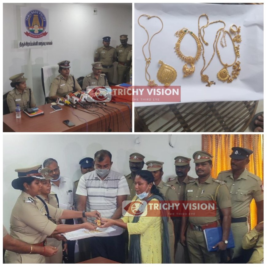 திருச்சி மாநகர காவல் ஆணையர் சத்ய பிரியா செய்தியாளர்களுக்கு பேட்டி. பெரம்பலூரை சேர்ந்த ராணுவ வீரர் தனது மனைவியுடன் கடந்த மாதம் 12.03.2023ம் தேதி அன்று திருச்சி என் எஸ் சி போஸ் ரோடு பகுதிக்கு கைப்பையில் தங்கம் மற்றும் பணத்தை எடுத்துக் கொண்டு பேருந்தில் பயணம் செய்தனர். அப்பொழுது 27 பவுன் தங்க நகைகளை அவரது பையில் இருந்து திருடி சென்றனர். இது தொடர்பாக தனிப்படையை அமைக்கப்பட்டு குற்றவாளிகளை போலீசார் தேடி வந்தனர். மூன்று பேர் கூட்டாக இதுபோன்று தொடர் வழிப்பறியில் ஈடுபடுவதாக போலீசார் விசாரணையில் தெரியவந்துள்ளது. ரவி என்பவர் தற்பொழுது கைது செய்யப்பட்டு அவரிடம் இருந்து 25 பவுன் தங்க நகைகள் மீட்கப்பட்டுள்ளது. மீதம் 2 பெண்களை தொடர்ந்து காவல்துறையினர் தேடி வருகின்றனர் கடந்த ஜனவரி மாதத்தில் இருந்து இதுவரை குற்ற வழக்குகள் 43 பதியபட்டுள்ளது அதில் 35 வழக்குகள் கண்டுபிடிக்கப்பட்டுள்ளது. எட்டு வழக்குகள் நிலுவையில் உள்ளது.