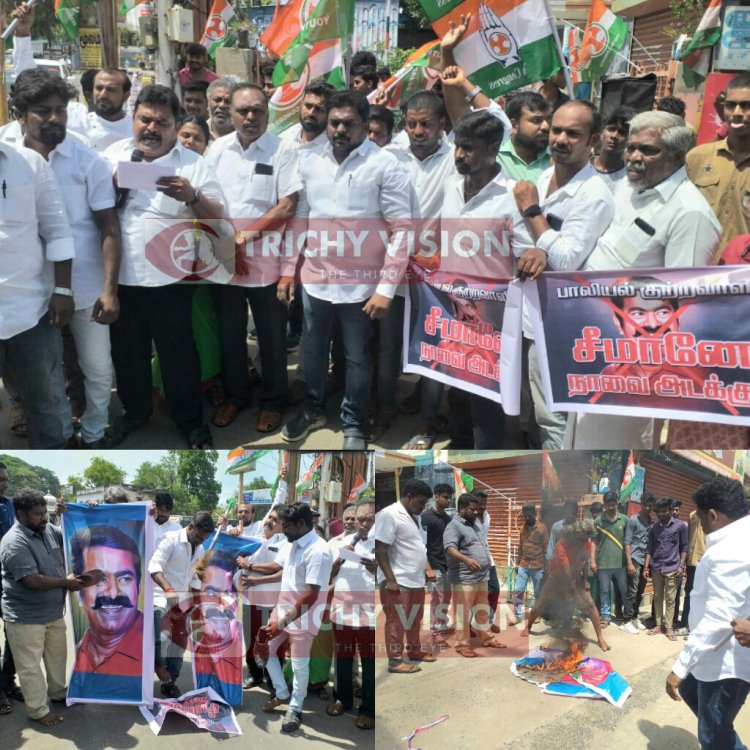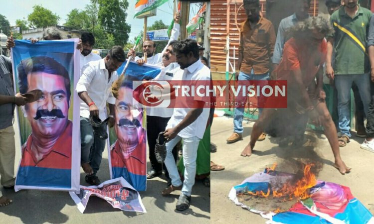 அப்போது சீமானின் உருவப் படத்தை செருப்பு மற்றும் துடைப்பத்தால் அடித்தும், காலால் மிதித்தும், படத்தை எரித்து எதிர்ப்பை தெரிவித்தனர்.