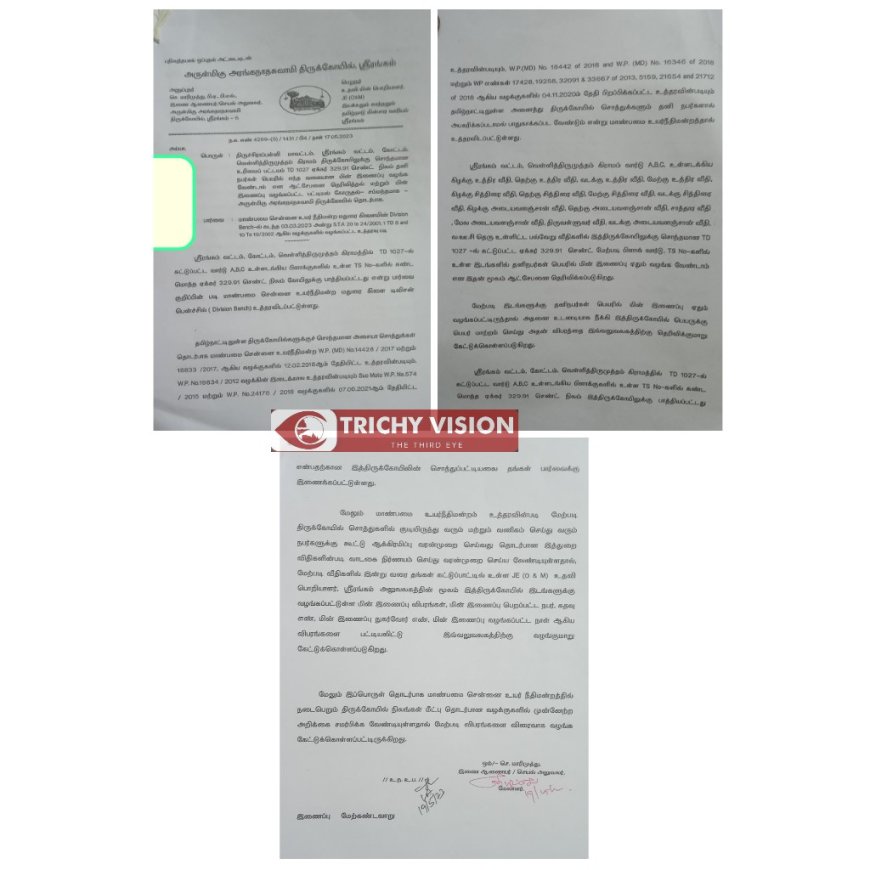 தமிழகத்திலுள்ள கோயில்களுக்குச் சொந்தமான அசையா சொத்துகள் தொடர்பான வழக்குகளில், அனைத்து கோயில் சொத்துகளும் தனி நபர் அபகரிக்கப்படாமல் பாதுகாக்கபட வேண்டும் என அதில் தெரிவிக்கப்பட்டுள்ளது. அதனடிப்படையில், ஸ்ரீரங்கம் தாலுகா, வெள்ளித்திருமுத்தம் கிராமம் வார்டு ஏபிசி உள்ளடக்கிய கிழக்கு உத்திர வீதி, தெற்கு உத்திர வீதி, வடக்கு உத்திரி வீதி, மேற்கு உத்திர வீதி, கிழக்கு, தெற்கு, மேற்கு, வடக்கு சித்திரை வீதிகள், கிழக்கு, தெற்கு அடையவளஞ்சான் விதிகள், சாத்தார கோயிலுக்குச் சொந்தமான டிடி. 1027ல் கட்டுப்பட்ட 329.91 ஏக்கர் இடத்தில் பிளாக் வார்டு, டவுன்களில் தனிநபர்கள் பெயரில் மின் இணைப்பு ஏதும் வழங்க வேண்டாம் என ஆட்சேபனை தெரிவிக்கப்படுகிறது.